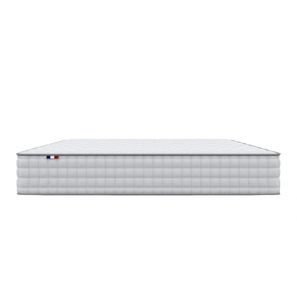 Pack prêt à dormir ASTRE – confort équilibré et qualité française Découvrez le pack prêt à dormir ASTRE, une solution complète qui associe un matelas ressorts ensachés, un sommier tapissier en kit gris et un ensemble couette + oreillers. Fabriqué en France, cet ensemble garantit un confort durable, une ventilation optimale et une installation simple pour des nuits sereines. Matelas astre – soutien ferme et confort équilibré Le matelas ASTRE combine la technologie des ressorts ensachés à des matériaux fiables pour offrir un maintien précis et un accueil équilibré. Chaque ressort réagit indépendamment pour s’adapter aux courbes du corps tout en maintenant une indépendance de couchage idéale, parfaite pour les couples. Nombre de ressorts selon la taille : 90×190 / 90×200 : 378 ressorts 140×190 / 140×200 : 594 ressorts 160×200 : 700 ressorts Grâce à cette conception, le poids est réparti uniformément pour réduire les points de pression et maintenir la colonne vertébrale bien alignée. L’épaisseur totale du matelas est de 18 cm, idéale pour un soutien stable et un confort quotidien. Matériaux fiables et confort respirant La face de couchage comprend 4,5 mm de mousse et 200 g/m² de ouate hypoallergénique pour un accueil doux et agréable. La face inférieure en tissu 3D respirant assure une aération continue du matelas, limitant l’humidité et prolongeant sa durée de vie. Le coutil stretch est traité anti-acariens, antibactérien et hypoallergénique<