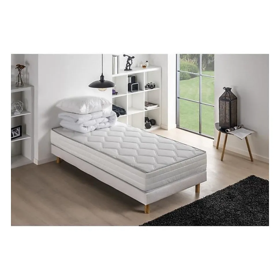 - Pack complet prêt à l’emploi comprenant matelas 90 x 190 cm, sommier tapissier, couette 140 x 200 et oreiller 60 x 60 pour une installation immédiate.