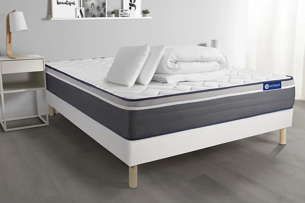 ACTISOM est une marque française développée en partenariat avec les plus grands experts européens du sommeil et de la literie. Après plusieurs années de recherche et de développement, nous avons mis au point des technologies innovantes (Actisoft – Actifresh – Acticell) afin de vous garantir d’excellentes nuits de sommeil. Tous nos matelas sont garantis 7ans et leur fabrication bénéficie d’un contrôle qualité très performant. Nos usines respectent les normes technologiques et environnementales européennes en vigueur.L’avis de notre expert: Le matelas Actilatex PLUS d’une épaisseur de 26cm est un matelas haut de gamme de la marque ACTISOM. Composé de 4 technologies innovantes que sont la mousse mémoire de forme, le latex, la mousse actiSoft et une mousse haute densité, ce matelas vous procure une incroyable sensation de bien-être et de repos. Idéal pour les personnes à la recherche d’une récupération optimale.• Epaisseur 26 cm• Plateau pour les 2 faces 3cm Latex + Mousse polyuréthane à mémoire de forme + mousse polyuréthane actiSoft• Bloc mousse polyuréthane haute densité 20cm• Coutil 100% polyester micro-perforé ultra respirable• Confort Très ferme • Type de sommier : Tapissier à lattes démontable à assembler soi même• Épaisseur : 14 cm• Structure et traverses de renfort en pin massif• 2×15 lattes multiplis• Garnissage fibres 100% polyester 120G/M2• Tissu maille 100% polyester 260G/M2• Pieds : Bois 15cm fournis• Montage facile : le montage pourra être effectué par une personne seule en seulement 10 minutes• 2 Oreillers mousse polyuréthane à mémoire de forme 50kg/m3• Housse intérieure en viezeline (100% polyester)• Housse extérieure déhoussable par fermeture zip et lavable (50% coton – 50% polyester)• Couette Percale• Garnissage fibres creuses 100% polyester 350gr/m2• Tissu 100% Coton 80 fils • Epaisseur 26 cm• Plateau pour les 2 faces 3cm Latex + Mousse pol