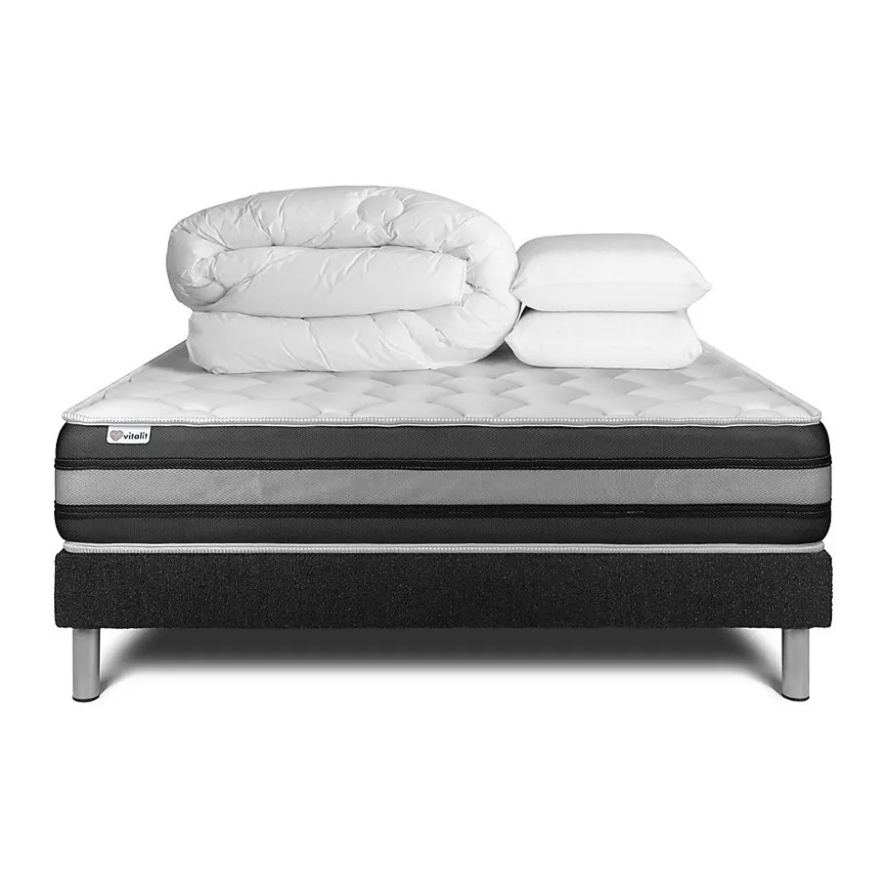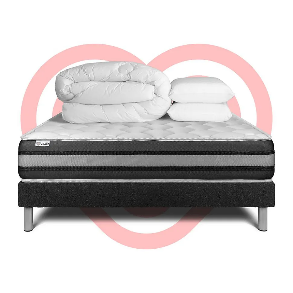Faites le plein d’énergie positive grâce aux solutions de literie énergisantes Vitalit qui allient confort, maintien et souplesse et permettre à votre corps de prendre le temps de se revitaliser. Les matelas et sommiers Vitalit sont pensés pour s’adapter aux spécificités corporelles et au sommeil de chacun. De fabrication portugaise, les produits Vitalit sont rigoureusement élaborés selon des cahiers des charges précis. Jusqu’à la livraison, notre objectif : votre satisfaction.Le matelas hybride VITALSPRING ZEN bénéficie d’un accueil enveloppant et d’un soutien ferme. Ce matelas de 26 cm d’épaisseur est doté de 5 zones de confort et est composé de 2 technologies : la mousse à mémoire de forme et les ressorts ensachés. Cette association technologique permet d’obtenir un soutien morphologique très précis et une parfaite indépendance de couchage. Son coutil micro perforé ultra respirable garantie une aération optimisée.Epaisseur de 26 cmÂme ressorts ensachés 17 cmNombre de ressorts ensachés : 744 pour le 160x200cmCarénage mousse polyuréthane 30kgMousse polyuréthane à mémoire de forme D 55 kg + Mousse polyuréthane Soft HDFibres 100% Polyester 350G/M2Plate-Bande 3D micro-aérée 100% Polyester pour optimiser l’aération du matelasCoutil micro perforé ultra respirable 100% Polyester5 zones de confortConfort : Ferme – Accueil enveloppant – Soutien fermeSommierSommier Tapissier à lattes en kit à assembler soi mêmeNombre de lattes : 2 x 16 lattes multiplisStructure et traverses de renfort en pin massifTissu Maille 100% polyester 855 G/M2 respirableHauteur 14cm + Pieds acier 15cm (fournis)Adapté pour tous types de matelasMontage facile par une personne seule en moins de 15 minOREILLERS2 x Oreillers mémoire de forme 60 x 40 cmMousse polyuréthane à mémoire de forme D50kgHousse
