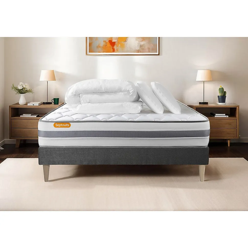 Le matelas Memo Spring de la marque Septnuits est constitué d’une âme en ressorts ensachés procurant un soutien très précis point par point avec 3 zones différenciées. Sa conception unique vous offrira un soutien ferme et un accueil dynamique. Sa Plate-bande 3D micro aérée, associée à son coutil micro perforé ultra respirable et sa fibre polyester vous garantissent une ventilation active du matelas. Sa maxi épaisseur vous assure une nuit de bien-être. Son plus ses ressorts ensachés pour une parfaite indépendance de couchage.- Type de matelas : Mémoire de forme- Epaisseur : 22 cm- Confort : ferme- Accueil : Ferme avec 2,5 cm de mousse polyuréthane à mémoire de forme D55kg + 2 cm mousse polyuréthane Hypersoft + Fibres 100% Polyester 350G/M2- Soutien : Ame 744 Ressorts ensachés- Indépendance de couchage : Très bonne- Coutil : Tissu 100% polyester Micro perforé ultra-respirable- Bande latérale : Tissu 100% polyester Micro perforé ultra-respirable- Face de couchage : Réversible- Densité : 55 kg/m3- Certification : Label Oeko-Tex Standard 100- Nos matières premières sont certifiées par le label textile OEKO-TEX- Sommier tapissier à assembler soi même- Nombre de lattes : 2×15 lattes multiplis- Structure et traverses de renfort en pin massif- Garnissage fibres 100% Polyester 120G/M2- Tissu Maille 100% polyester 260 G/M2- Hauteur 14cm + Pieds bois en pin naturel 15cm- Oreiller mémoire de forme 60 x 40 cm- Mousse polyuréthane à mémoire de forme D50kg- Housse intérieure en vlieseline (100% Polyester)- Housse extérieure déhoussable par fermeture zip et lavable (50% coton – 50% polyester)- Couette 350g Percale- Tissu 100% Coton 80 fils- Garnissage Fibres creuses 100% polyester 350gr/m2 – Type de matelas : Mémoire de forme- Epaisseur : 22 cm- Confort : ferme- Accueil : Ferme avec 2,5 cm de mousse polyuréthane à mémoire de forme D5