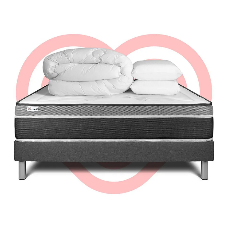 Faites le plein d’énergie positive grâce aux solutions de literie énergisantes Vitalit qui allient confort, maintien et souplesse et permettre à votre corps de prendre le temps de se revitaliser. Les matelas et sommiers Vitalit sont pensés pour s’adapter aux spécificités corporelles et au sommeil de chacun. De fabrication portugaise, les produits Vitalit sont rigoureusement élaborés selon des cahiers des charges précis. Jusqu’à la livraison, notre objectif : votre satisfaction.Découvrez notre matelas hybride haut de gamme VITAL CARE. D’une épaisseur de 26 cm, il allie les meilleures technologies à savoir mousse à mémoire de forme, ressorts ensachés et mousse Hypersoft lui conférant un confort équilibré, un accueil moelleux et un soutien ferme. Ses 7 zones de confort vous permettent une excellente indépendance de couchage et un sommeil réparateur. Optez pour le meilleur du confort et du bien-être.Type de matelas : Mousse polyuréthane à mémoire de forme + ressorts ensachésEpaisseur : 26 cmÂme ressorts ensachés 17 cmCarénage mousse polyuréthane 30kgConfort : EquilibréAccueil : moelleuxSoutien : fermeMousse polyuréthane à mémoire de forme D 55 kg + Mousse polyuréthane Soft HDNombre de ressorts ensachés : 806 pour le 180x200cmIndépendance de couchage : ExcellenteCoutil : Coutil 100% polyester micro perforé ultra-respirablePlate-Bande 3D micro-aérée 100% Polyester pour optimiser l’aération du matelasFibres 100% Polyester 350G/M2Face de couchage : Réversible7 zones de confortCertification : Label Oeko-Tex Standard 100SommierSommier Tapissier à lattes en kit à assembler soi mêmeNombre de lattes : 2 x 16 lattes multiplisStructure et traverses de renfort en pin massifTissu Maille 100% polyester 345G/M2 respirable et résistant certifié OEKO-TEX Standard 100Hauteur 14cm + <