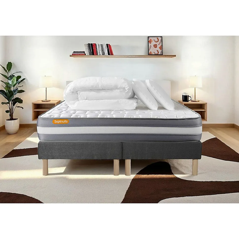 Le matelas Memo Plus de la marque Septnuits bénéficie des dernières innovations en matière de mousse à mémoire de forme pour vous offrir le confort et le soutien unique pour un sommeil récupérateur. Avec un soutien ferme, son accueil enveloppant s’adapte parfaitement à votre morphologie et allège les points de pression en épousant parfaitement votre corps. Ses matériaux de haute qualité : Plate-bande 3D micro aérée, son coutil ultra respirable et sa fibre polyester vous garantissent une aération totale du matelas pour une hygiène optimale.- Type de matelas : Mémoire de forme- Epaisseur : 24 cm- Confort : ferme- Accueil : Ferme avec 1cm de mousse polyuréthane à mémoire de forme D55kg + 4 cm mousse polyuréthane Hypersoft + Fibres 100% Polyester 350G/M2- Soutien : Ferme composé de mousse polyuréthane Haute Densité 16 cm- Indépendance de couchage : Très bonne- Coutil : Tissu 100% polyester Micro perforé ultra-respirable- Bande latérale : Tissu 100% polyester Micro perforé ultra-respirable- Face de couchage : Réversible- Densité : 55 kg/m3- Certification : Label Oeko-Tex Standard 100- Nos matières premières sont certifiées par le label textile OEKO-TEX- Sommier tapissier Monobloc- Nombre de lattes : Multi 2×12 lattes en peuplier massif- Structures et traverses de renfort en peuplier massif- Garnissage fibres 100% Polyester 120G/M2- Tissu Maille 100% polyester 260 G/M2- Toile de fond anti-poussières 100% polyester- Hauteur 14cm + Pieds bois en pin naturel 15cm- Oreiller mémoire de forme 60 x 40 cm- Mousse polyuréthane à mémoire de forme D50kg- Housse intérieure en vlieseline (100% Polyester)- Housse extérieure déhoussable par fermeture zip et lavable (50% coton – 50% polyester)- Couette 350g Percale- Tissu 100% Coton 80 fils- Garnissage Fibres creuses 100% polyester 350gr/m2 – Type de matelas : Mémoire de forme- Epaisseur : 24 cm<