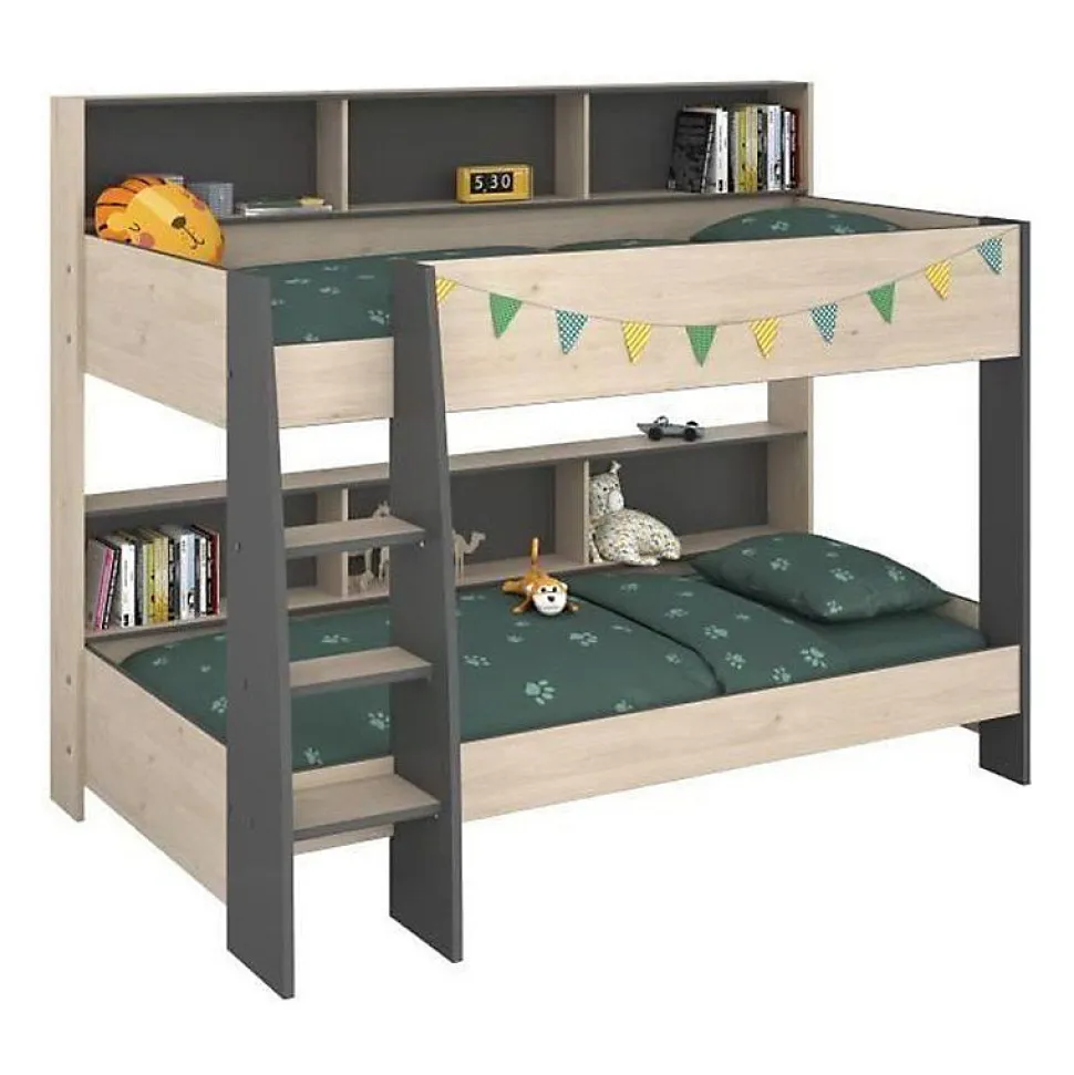 Lit superposé enfant PARISOT 2x90x200 cm imitation Chêne Jackson et Gris Ombre, sommiers à lattes inclus, rangements intégrés, fabrication française, dimensions totales L207 x P132 x H164,5 cm. Matelas non inclus. Montage à effectuer soi‑même.