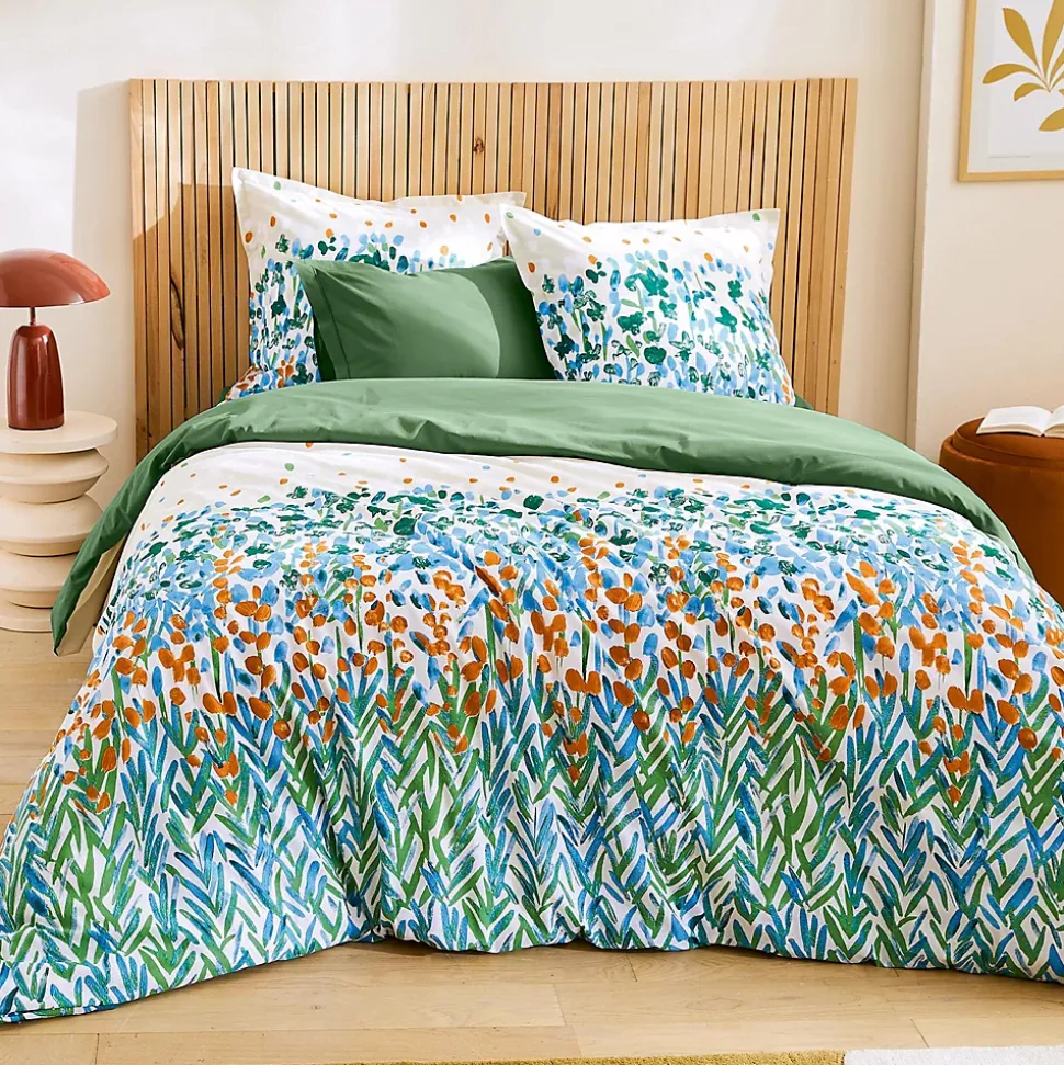 - Parure de lit composée d’une housse de couette 280×240 cm et 2 taies 50×70 cm unies EVASION Vert fougère 100% coton avec des motifs de végétation vert, bleu et corail.