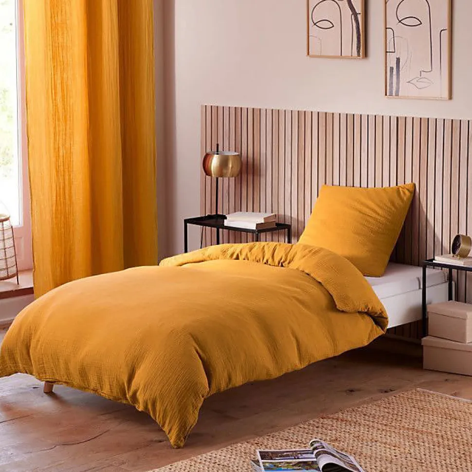 Parure 140 x 200 pour lit 1 place composée d’une housse de couette 140 x 200 cm et d’une taie d’oreiller 65 x 65 cm. Matière : 100% double gaze de coton 125 g/m², dessus délicatement gaufré, dessous en coton 57 fils/cm². Entretien : lavage machine 40°C, sèche-linge autorisé, pas de repassage nécessaire. Certifié Oeko‑Tex. Coloris : orange vif uni.