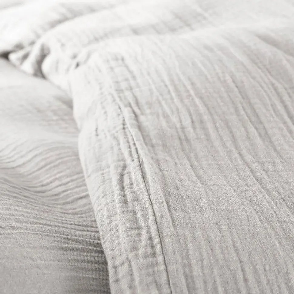 Parure complète 140 x 200 en double gaze de coton 125 g/m² — housse 140×200 + taie 65×65 cm. Matière légère, fluide et très douce, aspect naturellement froissé proche du lin, certifiée Oeko-Tex, finition boutonnée, lavable en machine à 40°C et sèche-linge autorisé. Conçue pour lit 1 place.
