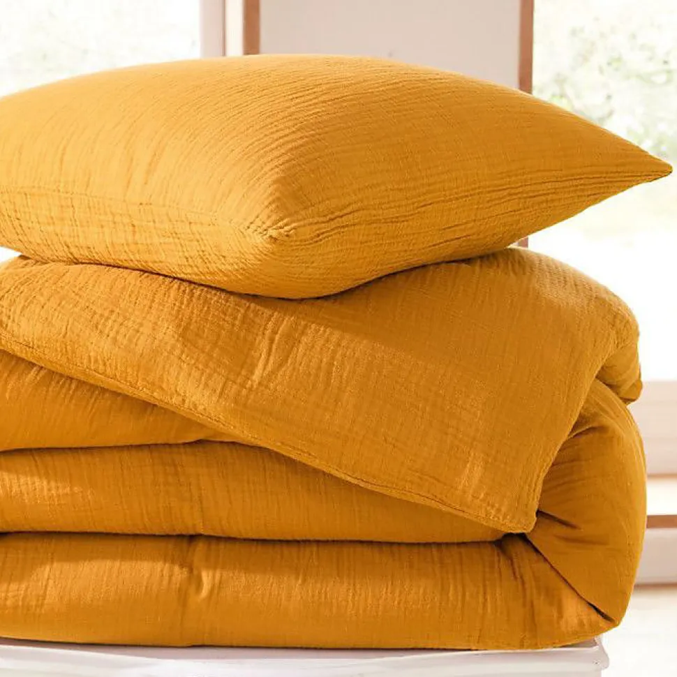 Parure complète 240 x 220 en double gaze de coton 125 g/m² : très grande douceur, recto en gaze / envers coton 57 fils/cm², fermeture par boutons, certifiée Oeko-Tex, entretien facile (machine 40°C, sèche-linge autorisé). Disponible en Orange.