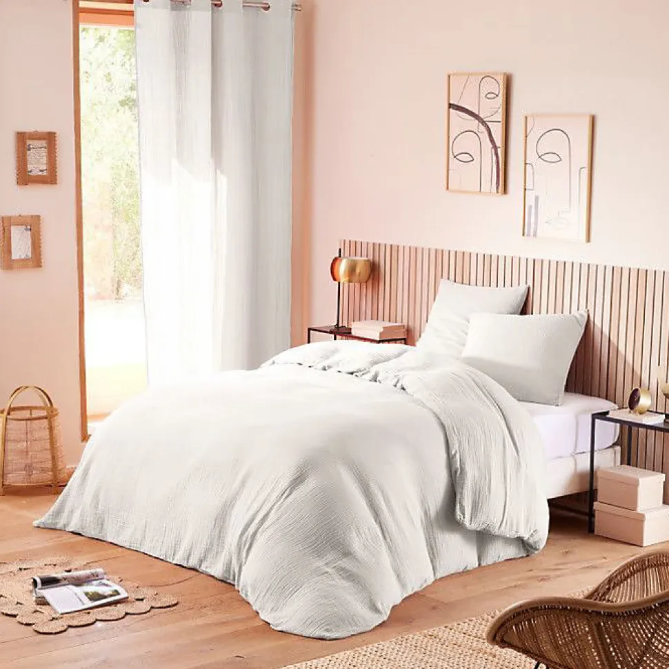 Descriptif :Craquez pour ces parures de couette en 260 x 240 pour lit 160 x 200 cm à 180 x 200 cm composée de :1 Housse de couette 260 x 240 + 2 Taies d’oreiller 65 x 65 cmEn gaze de coton, une matière légère, fluide et surtout très douce.La gaze de coton est une matière confortable, qui s’inscrit dans la tendance des matières naturelles et faciles à vivre.Aujourd’hui, elle arrive dans nos intérieurs avec le linge de