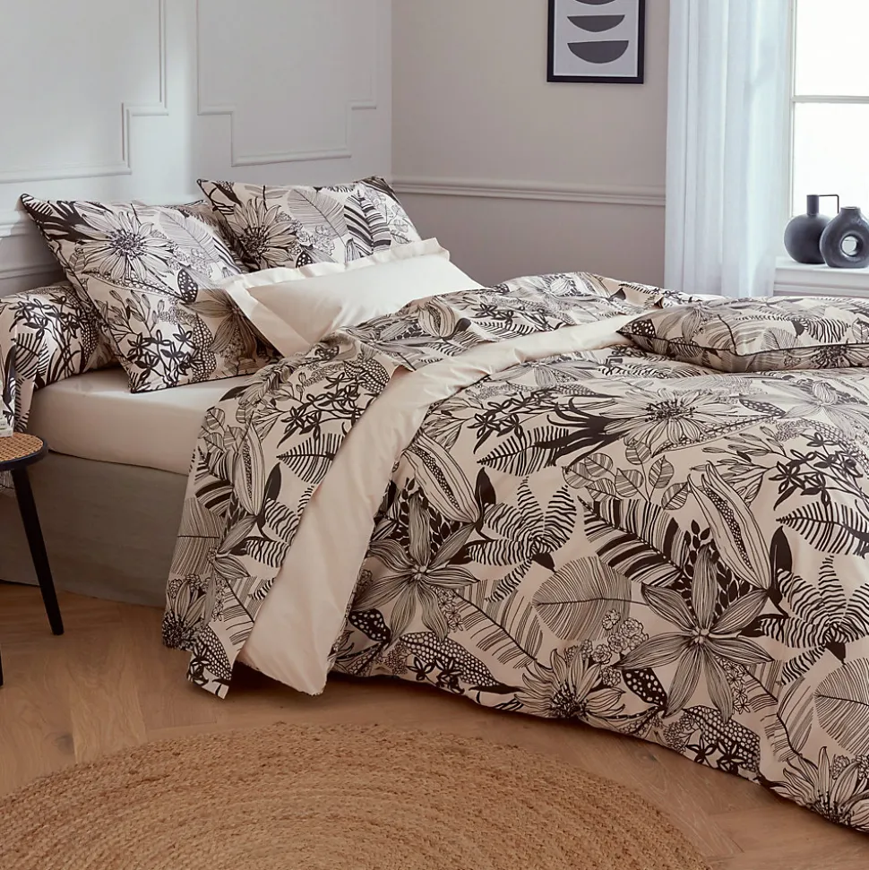 Parure de lit 140×200 cm percale de coton ALBA beige/noir 2 piècesTransformez votre chambre à coucher en un jardin luxuriant avec notre collection ALBA. Confectionnée en percale de pur coton peigné, elle vous offrira une douceur exceptionnelle tout en vous entourant de la beauté apaisante de la végétation. Sur ton de beige, son motif all-over de fleurs et feuilles tracées en noir figure un jardin exotique chic et sobre. Le verso uni apporte calme et tempérance à l’ensemble.Linge de lit imprimé en percale avec un tissage 80 fils/cm2 très serrés pour une grande résistance et une excellente tenue. Traité Easycare pour un repassage facile et certfiée OEKO-TEX .La collection ALBA se décline en housse de couette (140×200 cm, 200×200 cm, 240×220 cm, 260×240 cm, 280×240 et 300×240 cm), drap plat (180×290 cm, 240×310 cm, 280×325 cm), taie d’oreiller (65×65 cm, 50×70 cm) et taie de traversin (43×140 cm, 43×200 cm, 43×240 cm).La collection ALBA est fabriquée en France.Côté technique :Matière : 100% percale de cotonQualité : 80 fils/cm2Couleurs garanties grand teintMotifs : fleursTraitement Easycare (repassage facile)Dimensions de la housse de couette : 140×200 cmDimensions de la taie d’oreiller : 50×70 cmFabriqué en FranceLes plus du produit :Belle qualité de tissu et des motifs imprimés sur ce linge de lit en percale de coton.Linge de lit certifié Standard 100 OEKO-TEX, pour des produits meilleurs pour votre santé.Collection disponible avec housse de couette, drap plat, taie d’oreiller et taie de traversin vendus séparément ou en parure.Côté pratique : Entretien facile, lavage en machine à 60°C, javel et clore interdit, séchage en sèche-linge à température réduite.Conseils : Lavez votre linge