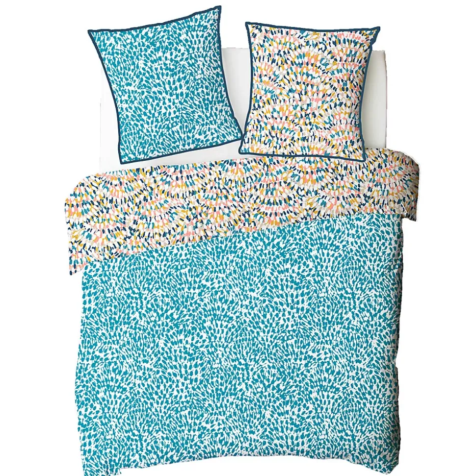 Parure de lit en coton réversible imprimé 57 fils multicolore comprenant 1 housse de couette + 2 taies d’oreiller 63x63cm.Avec notre parure de lit ORIANE en 100% coton, nous avons opté pour un motif floral abstrait.Ces motifs d’inspiration traditionnels, déclinés dans une gamme de tons neutres rose et vert, revisitent avec succès le style floral qu’on aime tant. N’attendez plus, et craquez vous aussi pour notre parure de lit ORIANE.Ce linge de lit imaginé par nos stylistes, conçu dans un tissage 57 fils/cm² est composé d’une housse de couette réversible finition boutons qui sauvera votre couette d’une évasion certaine.COMPOSITIONS PRODUIT :Matière : 100% cotonCouleur : Multicolore, rose, vert, bleuCertification : OEKO-TEXLavage : à 60° en machine2 taies d’oreiller 63x63cm finition biais plat 5mmLa parure de lit ORIANE vous est envoyée dans un pochon en tissu réutilisable, aux motifs de la housse de couette, et transformable en tote-bag une fois que vos draps trôneront fièrement sur votre lit. En savoir plus :Ce produit labélisé STANDARD 100 by OEKO-TEX – certificat n° 18.HPK48415 HOHENSTEIN HTTI suit un processus de fabrication certifié et contrôlé, respectueux de votre peau.Le STANDARD 100 by OEKO-TEX EST un label qui vous garantit que vos draps ne contiennent aucuns produits toxiques ni pour votre santé, ni pour l’environnement.
