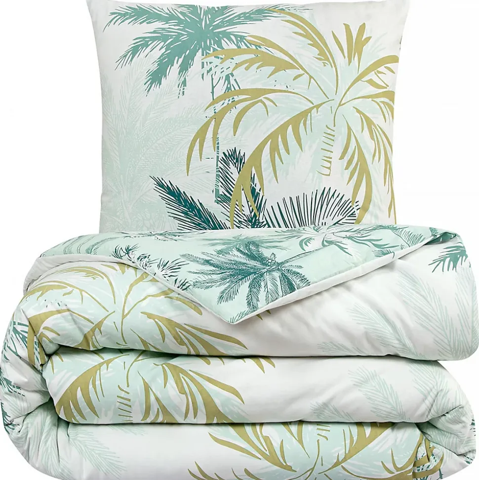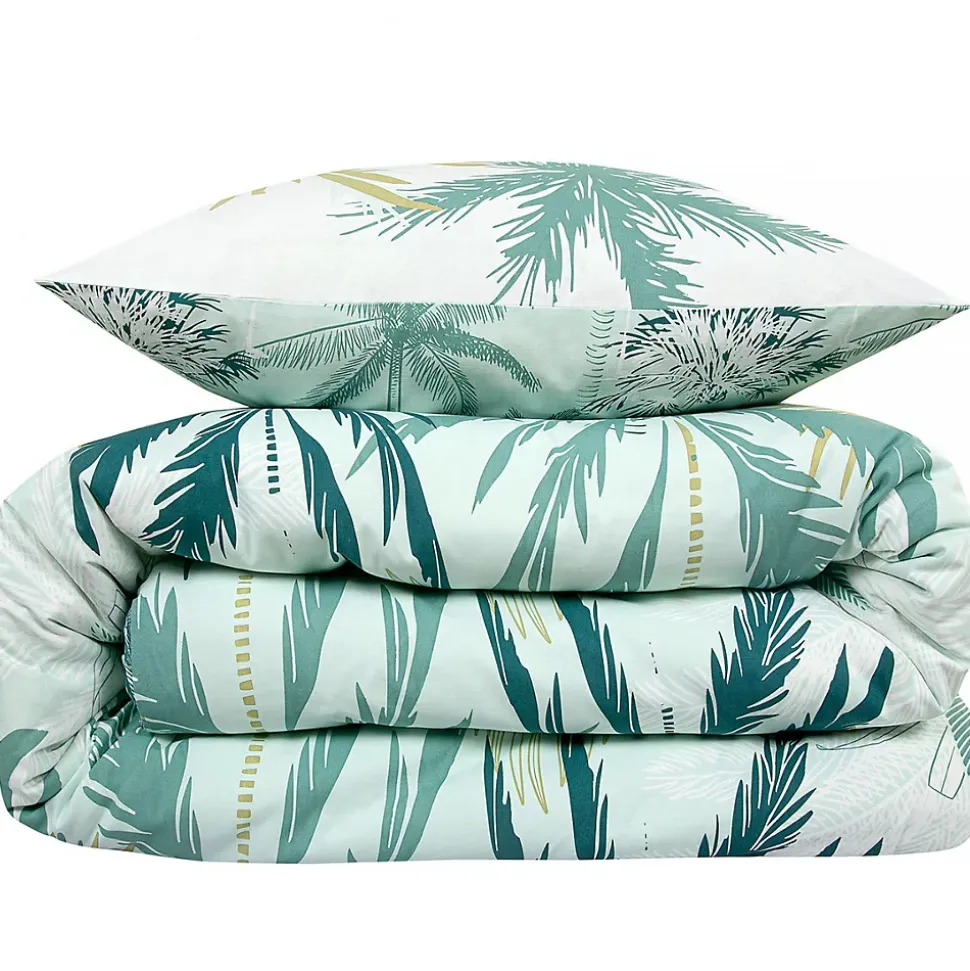 Parure de lit Réversible en Coton Imprimé PALMERAIE – 2 PersonnesApportez une note d’élégance et de fraîcheur à votre chambre avec la parure de lit PALMERAIE, idéale pour un lit double. Cet ensemble comprend une housse de couette et deux taies d’oreiller (63×63 cm), parfait pour deux personnes.Orné d’un joli motif de feuillages et de palmiers dans des nuances de vert et d’ocre sur fond blanc, cet ensemble réversible vous permet de modifier facilement l’atmosphère de votre chambre. Réalisé en coton de qualité 57 fils, il garantit une douceur agréable pour des nuits réparatrices et un confort optimal.Soucieuse de votre bien-être, cette parure est certifiée Oeko-Tex, ce qui vous assure l’absence de substances chimiques nuisibles. Facile à entretenir, elle se lave en machine à 60° et conserve sa douceur et ses couleurs au fil des utilisations.Les finitions avec boutons assurent un maintien sécurisé de la couette, et l’ensemble est présenté dans un pochon en coton réutilisable.Caractéristiques :Ensemble pour 2 personnes : 1 housse de couette + 2 taies d’oreiller (63×63 cm)Réversible avec un imprimé végétal blanc et vert100% coton, 57 filsLavable en machine à 60°CCertifié Oeko-TexFinitions boutonsPrésenté dans un pochon en coton réutilisablePourquoi opter pour cet ensemble ? Cette parure de lit est le choix parfait pour ceux qui recherchent à la fois confort, esthétisme et praticité. Vous bénéficierez d’une parure de lit à la fois agréable au toucher, facile à entretenir et durable dans le temps.