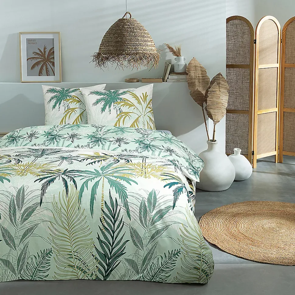 Parure de lit Réversible en Coton Imprimé PALMERAIE – 2 PersonnesApportez une note d’élégance et de fraîcheur à votre chambre avec la parure de lit PALMERAIE, idéale pour un lit double. Cet ensemble comprend une housse de couette et deux taies d’oreiller (63×63 cm), parfait pour deux personnes.Orné d’un joli motif de feuillages et de palmiers dans des nuances de vert et d’ocre sur fond blanc, cet ensemble réversible vous permet de modifier facilement l’atmosphère de votre chambre. Réalisé en coton de qualité 57 fils, il garantit une douceur agréable pour des nuits réparatrices et un confort optimal.Soucieuse de votre bien-être, cette parure est certifiée Oeko-Tex, ce qui vous assure l’absence de substances chimiques nuisibles. Facile à entretenir, elle se lave en machine à 60° et conserve sa douceur et ses couleurs au fil des utilisations.Les finitions avec boutons assurent un maintien sécurisé de la couette, et l’ensemble est présenté dans un pochon en coton réutilisable.Caractéristiques :Ensemble pour 2 personnes : 1 housse de couette + 2 taies d’oreiller (63×63 cm)Réversible avec un imprimé végétal blanc et vert100% coton, 57 filsLavable en machine à 60°CCertifié Oeko-TexFinitions boutonsPrésenté dans un pochon en coton réutilisablePourquoi opter pour cet ensemble ? Cette parure de lit est le choix parfait pour ceux qui recherchent à la fois confort, esthétisme et praticité. Vous bénéficierez d’une parure de lit à la fois agréable au toucher, facile à entretenir et durable dans le temps.