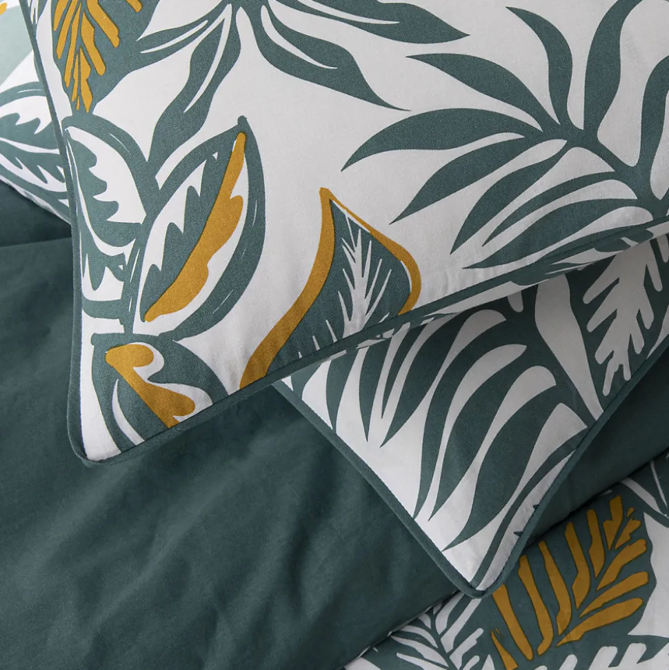Parure de lit Réversible en Coton Imprimé – pour 2 PersonnesAjoutez une touche de fraîcheur et de raffinement à votre chambre avec la parure de lit Sally, un ensemble blanc décoré de motifs feuillages verts, idéal pour un lit double. Cet ensemble réversible comprend une housse de couette et deux taies d’oreiller (63×63 cm), parfait pour apporter une atmosphère naturelle et apaisante. Fabriqué en 100% coton de haute qualité, Sally allie douceur et confort pour des nuits reposantes. Son tissage de 57 fils assure une grande résistance et un toucher agréable, pour un style et une qualité qui durent.Conçu dans le respect de votre santé, cette parure est certifiée Oeko-Tex, garantissant l’absence de produits chimiques nocifs. Elle est lavable en machine à 60°C, facile à entretenir et conserve ses couleurs de manière optimale. Son design moderne, la douceur de son coton et son engagement pour la planète en font un choix idéal pour allier style et confort.Les finitions boutons assurent un maintien de la couette. L’ensemble est présenté dans un pochon en coton réutilisable.Caractéristiques :Ensemble pour 2 personnes : 1 housse de couette + 2 taies d’oreiller (63×63 cm)Réversible avec un imprimé végétal vert100% coton, 57 filsLavable en machine à 60°CCertifié Oeko-TexFinitions boutonsPrésenté dans un pochon en coton réutilisablePourquoi opter pour cette parure de lit en coton 57 fils ?Une parure en coton 57 fils allie parfaitement confort, robustesse et accessibilité. Douce, respirante et agréable au toucher, elle convient parfaitement à un usage quotidien. Simple à entretenir et durable, elle offre une solution pratique et abordable pour profiter d’un linge de lit de bonne qualité sans se ruiner.
