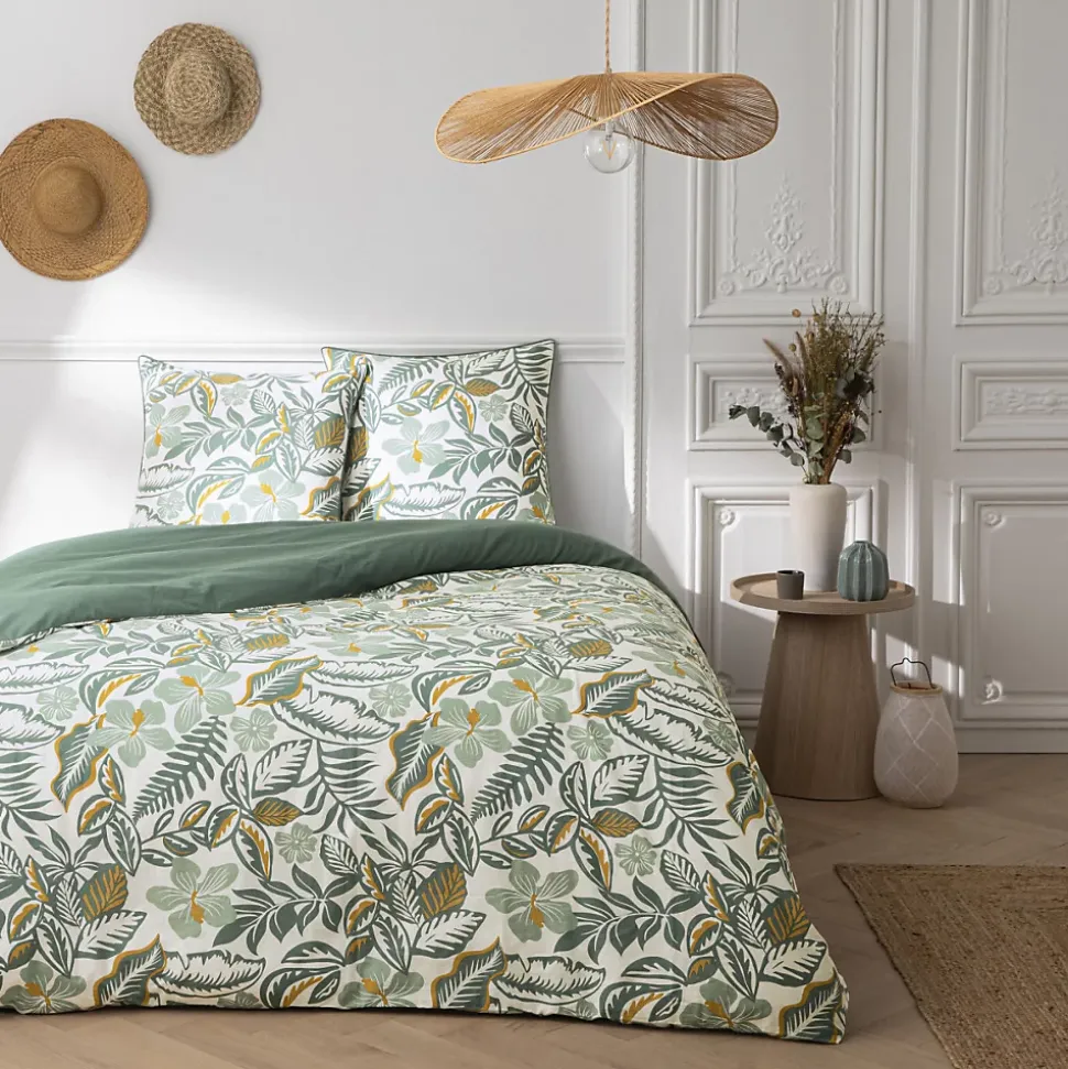Parure de lit Réversible en Coton Imprimé – pour 2 PersonnesAjoutez une touche de fraîcheur et de raffinement à votre chambre avec la parure de lit Sally, un ensemble blanc décoré de motifs feuillages verts, idéal pour un lit double. Cet ensemble réversible comprend une housse de couette et deux taies d’oreiller (63×63 cm), parfait pour apporter une atmosphère naturelle et apaisante. Fabriqué en 100% coton de haute qualité, Sally allie douceur et confort pour des nuits reposantes. Son tissage de 57 fils assure une grande résistance et un toucher agréable, pour un style et une qualité qui durent.Conçu dans le respect de votre santé, cette parure est certifiée Oeko-Tex, garantissant l’absence de produits chimiques nocifs. Elle est lavable en machine à 60°C, facile à entretenir et conserve ses couleurs de manière optimale. Son design moderne, la douceur de son coton et son engagement pour la planète en font un choix idéal pour allier style et confort.Les finitions boutons assurent un maintien de la couette. L’ensemble est présenté dans un pochon en coton réutilisable.Caractéristiques :Ensemble pour 2 personnes : 1 housse de couette + 2 taies d’oreiller (63×63 cm)Réversible avec un imprimé végétal vert100% coton, 57 filsLavable en machine à 60°CCertifié Oeko-TexFinitions boutonsPrésenté dans un pochon en coton réutilisablePourquoi opter pour cette parure de lit en coton 57 fils ?Une parure en coton 57 fils allie parfaitement confort, robustesse et accessibilité. Douce, respirante et agréable au toucher, elle convient parfaitement à un usage quotidien. Simple à entretenir et durable, elle offre une solution pratique et abordable pour profiter d’un linge de lit de bonne qualité sans se ruiner.
