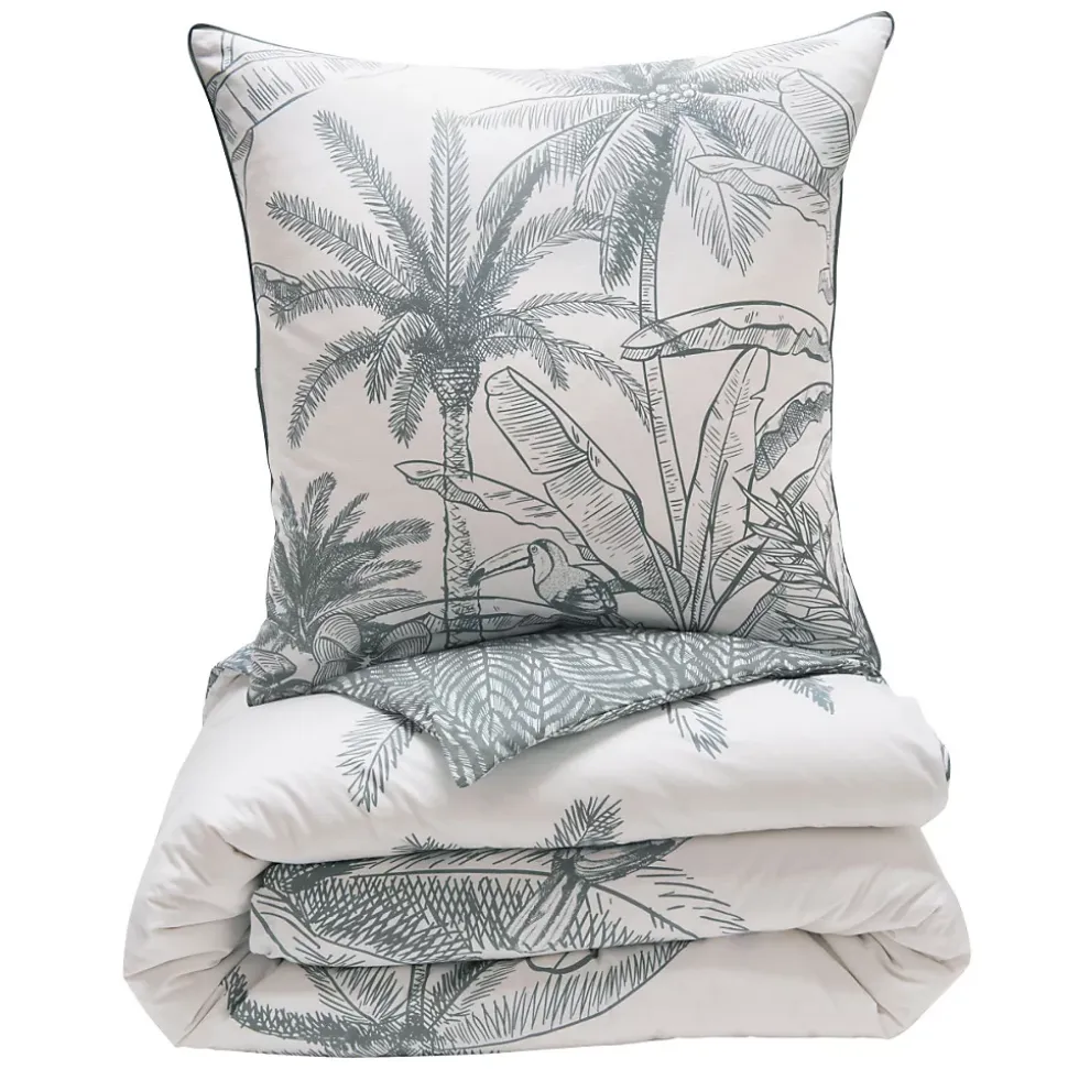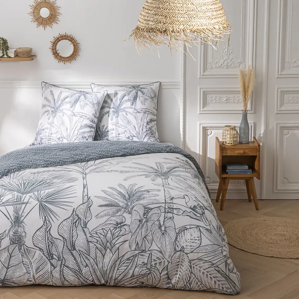 Parure de lit Réversible en Coton Imprimé – pour 2 PersonnesAjoutez une touche d’élégance et de fraîcheur à votre chambre avec l’ensemble de literie Sierra, spécialement conçu pour un lit double. Cet ensemble inclut une housse de couette et deux taies d’oreiller (63×63 cm), parfait pour deux personnes.Décoré de motifs de palmiers bleus sur fond blanc et doté d’un design réversible, cet ensemble vous permet de changer facilement l’ambiance de votre espace. Confectionné en 100 % coton de haute qualité, il offre une douceur agréable pour des nuits paisibles. Avec un tissage de 57 fils, il assure à la fois confort et durabilité.Conçu dans le respect de votre santé, cet ensemble est certifié Oeko-Tex, garantissant l’absence de produits chimiques nocifs. Il est lavable en machine à 60°, facile à entretenir et conserve ses couleurs de manière optimale.Les finitions boutons assurent un maintien sécurisé de la couette. La parure est présentée dans un pochon en coton réutilisable.Caractéristiques :Ensemble pour 2 personnes : 1 housse de couette + 2 taies d’oreiller (63×63 cm)Réversible avec un imprimé végétal blanc et bleu100% coton, 57 filsLavable en machine à 60°CCertifié Oeko-TexFinitions boutonsPrésenté dans un pochon en coton réutilisablePourquoi opter pour cet ensemble ? Son design moderne, la douceur de son coton et son engagement pour la planète en font un choix idéal pour allier style et confort à moindre coût.