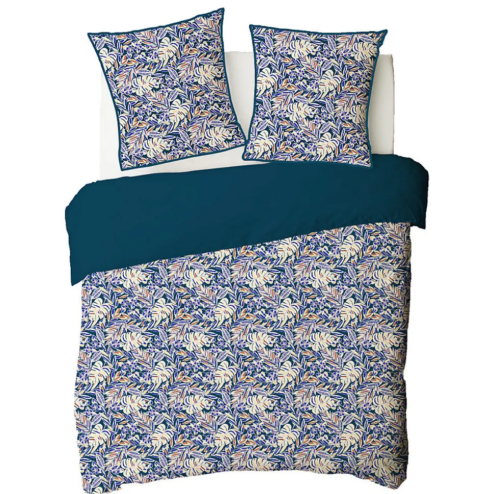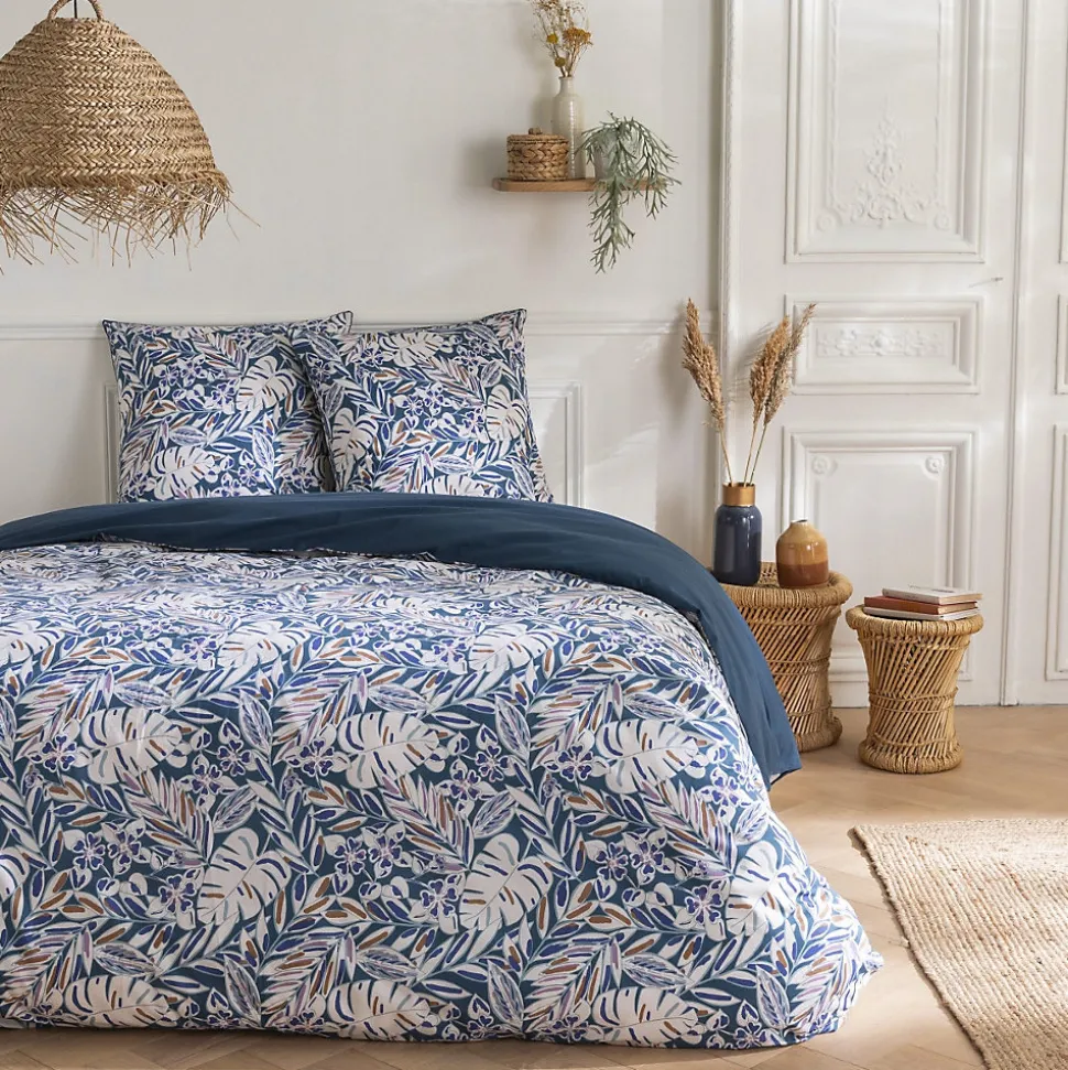 Parure de lit en coton réversible imprimé feuilles graphiques 57 fils bleu comprenant 1 housse de couette + 2 taies d’oreiller 63x63cm.Avec notre parure de lit NOUK en 100% coton, nous avons opté pour un motif de feuillages. Ces motifs d’inspiration naturel, déclinés dans une gamme de tons bleus, revisitent avec succès le style graphique qu’on aime tant. N’attendez plus, et craquez vous aussi pour notre parure de lit NOUK.Ce linge de lit imaginé par nos stylistes, conçu dans un tissage 57 fils/cm² est composé d’une housse de couette réversible finition boutons qui sauvera votre couette d’une évasion certaine.COMPOSITIONS PRODUIT :Matière : 100% cotonCouleur : Bleu, blanc et jauneMotif : VégétalCertification : OEKO-TEXLavage : à 60°C en machine2 taies d’oreiller 63x63cm finition biais lurexLa parure de lit NOUK vous est envoyée dans un pochon en tissu réutilisable, aux motifs de la housse de couette, et transformable en tote-bag une fois que vos draps trôneront fièrement sur votre lit. En savoir plus :Ce produit labélisé STANDARD 100 by OEKO-TEX – certificat n° 18.HPK48415 HOHENSTEIN HTTI suit un processus de fabrication certifié et contrôlé, respectueux de votre peau.Le STANDARD 100 by OEKO-TEX EST un label qui vous garantit que vos draps ne contiennent aucuns produits toxiques ni pour votre santé, ni pour l’environnement.
