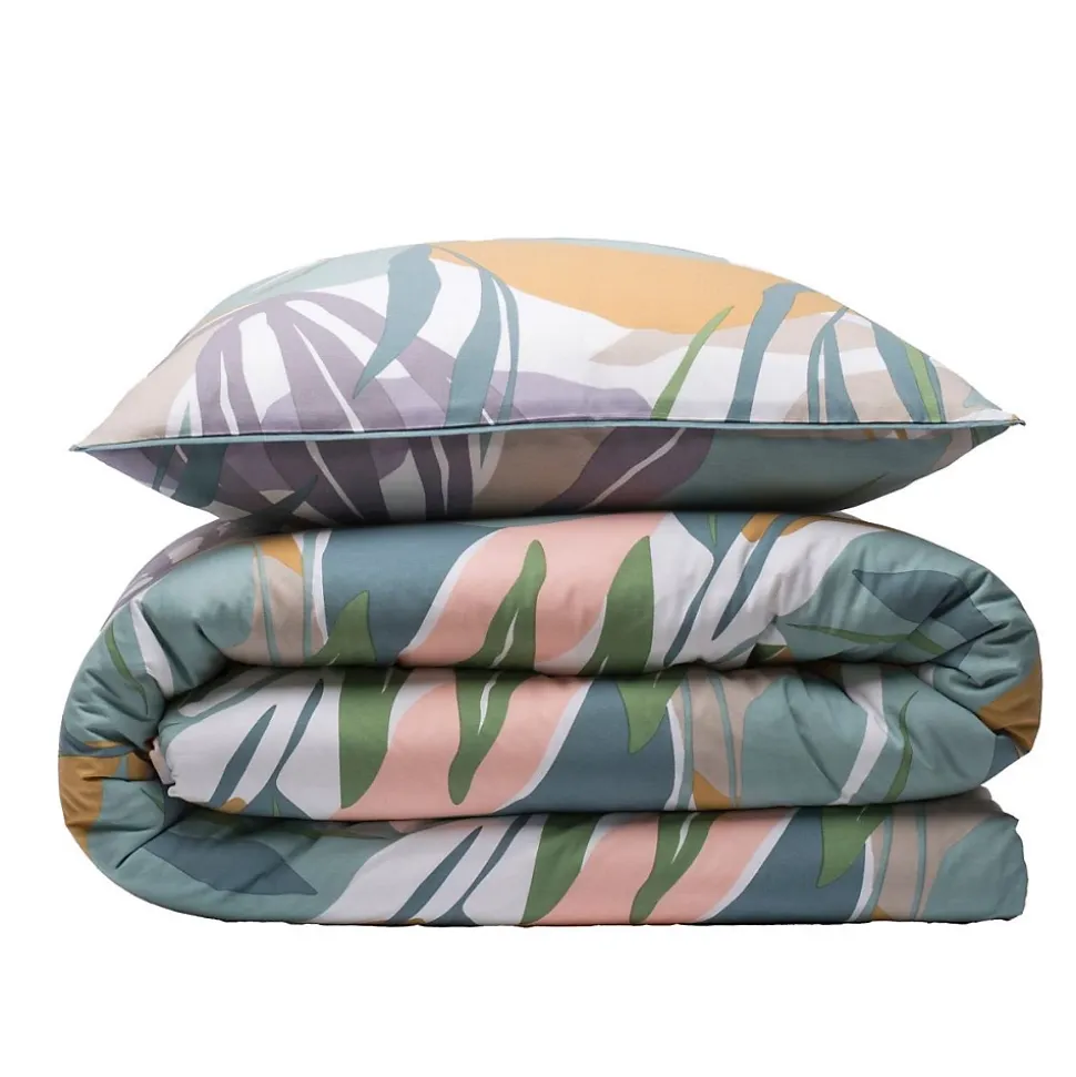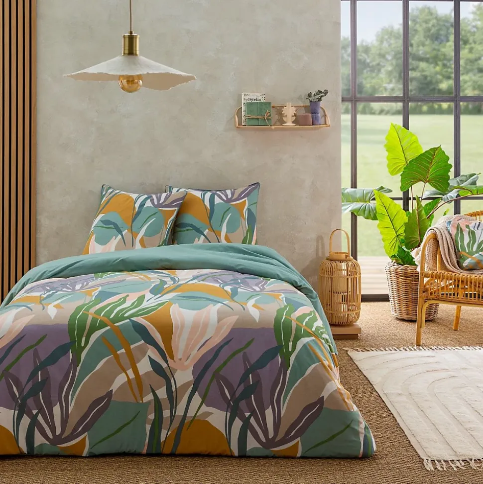 Parure de lit en coton réversible imprimé végétal abstrait 57 fils multicolore comprenant 1 housse de couette + 2 taies d’oreiller 63x63cm.Avec notre parure de lit PALMA en 100% coton, nous avons opté pour un motif végétal / tropical.Ces motifs d’inspiration nature, déclinés dans une gamme de tons neutres et pastels, revisitent avec succès le style jungle qu’on aime tant. Grâce à notre parure, vous aurez la possibilité de faire voyager votre intérieur et de ramener un esprit de nature jusqu’à chez vous. N’attendez plus, et craquez vous aussi pour notre parure de lit PALMA.Ce linge de lit imaginé par nos stylistes, conçu dans un tissage 57 fils/cm² est composé d’une housse de couette réversible finition boutons qui sauvera votre couette d’une évasion certaine.COMPOSITIONS PRODUIT :Matière : 100% cotonCouleur : Multicolore, violet, vert, jauneCertification : OEKO-TEXLavage : à 60° en machine2 taies d’oreiller 63x63cm finition piping 5mmLa parure de lit PALMA vous est envoyée dans un pochon en tissu réutilisable, aux motifs de la housse de couette, et transformable en tote-bag une fois que vos draps trôneront fièrement sur votre lit. En savoir plus :Ce produit labélisé STANDARD 100 by OEKO-TEX – certificat n° 18.HPK48415 HOHENSTEIN HTTI suit un processus de fabrication certifié et contrôlé, respectueux de votre peau.Le STANDARD 100 by OEKO-TEX EST un label qui vous garantit que vos draps ne contiennent aucuns produits toxiques ni pour votre santé, ni pour l’environnement.