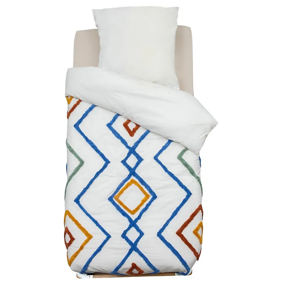 La parure de lit 2 pièces enfant « Adi » Atmosphera for kids est composée d’une housse de couette en coton lavé et d’une taie d’oreiller carrée qui équiperont un lit d’enfant de dimensions standards. Gaie et chaleureuse, cette parure de lit est surpiquée de motifs graphiques et colorés en coton tufté. 100 % coton lavé, 57 fils/cm2Motifs en coton tuftéFermeture de la housse de couette : 4 boutons Déballage et montage Lors de l’ouverture de votre colis, veillez à ne pas enfoncer une lame trop profondément pour éviter d’endommager le produit. Retirez les éléments de protection et d’emballage avec précaution, sans utiliser d’outils tranchants. Conservez l’emballage et la notice quelques jours en cas de retour ou de démontage. Consultez les consignes de tri de votre commune pour recycler correctement votre emballage. Conseils d’entretien La parure de lit 2 pièces enfant « Adi » est lavable en machine à 30°. Ne pas sécher en machine. Repassage à température moyenne (110°C à 150°C). Ne pas utiliser de produits de blanchiment. Ne pas nettoyer à sec.Dimensions produit : L.190 x l.137,7 x H.0,3 cmPoids : 1,4 Kg