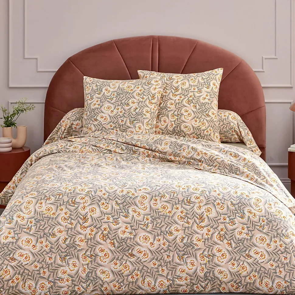 Achetez la parure de lit LILY en flanelle avec ses motifs apaisants de feuillages et fleurs dans des tons gris et orangé, composée d’une housse de couette 200×200 cm et de deux taies d’oreiller 65×65 cm.