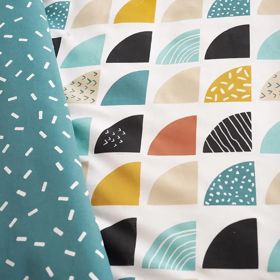 Parure de lit 200×200 cm mixte BLUE bleuOriginale et tendance, la parure de lit BLUE saura vous séduire par son motif all-over coloré et ses faces réversibles. Elle possède une face de couleur verte avec un motif de couleur blanche et une autre face blanche avec un all-over de motifs géographiques de toutes les couleurs. En polycoton, cette parure vous apportera également résistance et douceur. Le rêve !Côté technique :Matière : 52% polyester 48% cotonGrammage : 102 g/m2Finition : Housse de couette sans rabat, fermeture boutons et passe-mains forme rectangulaireTaies d’oreillers carrées 63×63 cm forme sac avec rabatFabriqué au PakistanLes plus du produit :Mélange de polyester et de coton pour une bonne résistanceLinge de lit certifié Standard 100 OEKO-TEX, pour des produits meilleurs pour votre santé.Collection BLUE disponible en parures de lit 140×200 cm avec une taie d’oreiller 63×63 cm, 200×200 cm et 240×220 cm avec 2 taies d’oreillers 63×63 cmCôté pratique :Entretien facile : lavage en machine à 40°C; séchage en sèche-linge à température réduite; javel et chlore interditsConseils : Lavez votre linge avant la première utilisation; respectez toujours les conseils d’entretien figurant sur l’étiquette du produit; retournez les housses de couettes et les taies d’oreillers pour les laver sur l’envers.Symboles d’entretien :Cycle normal 40°CPas de blanchimentSéchage en tambour autorisé, température modérée 60°CRepasser à une température maximale de semelle de fer de 110°CPas d’entretien professionnel à sec