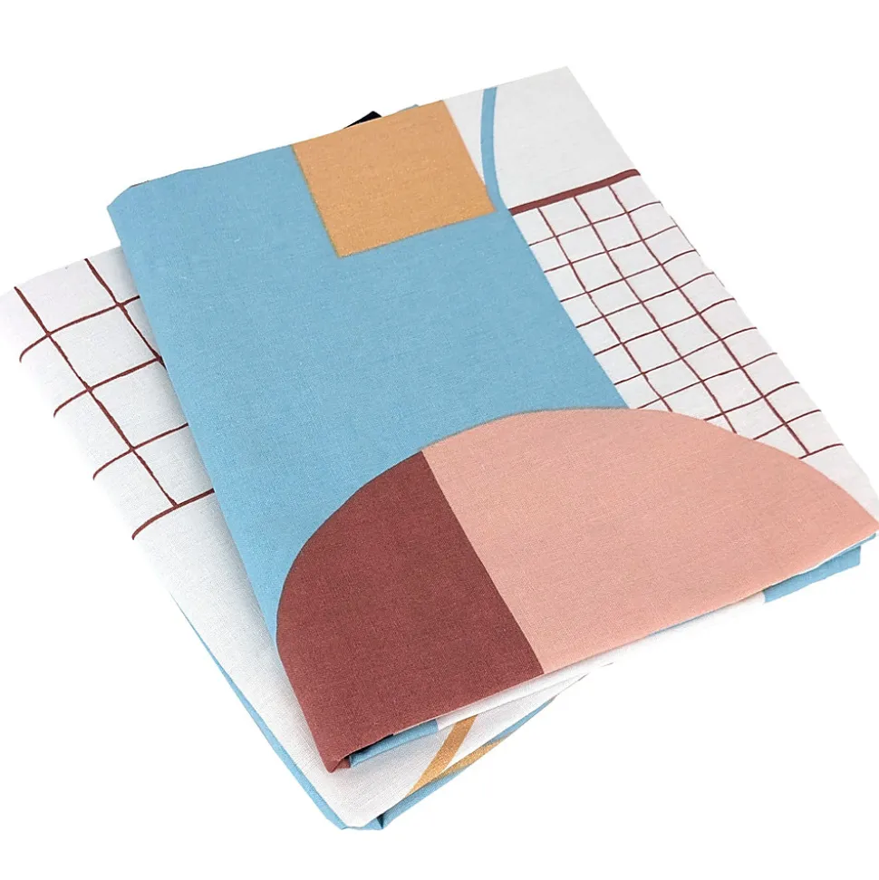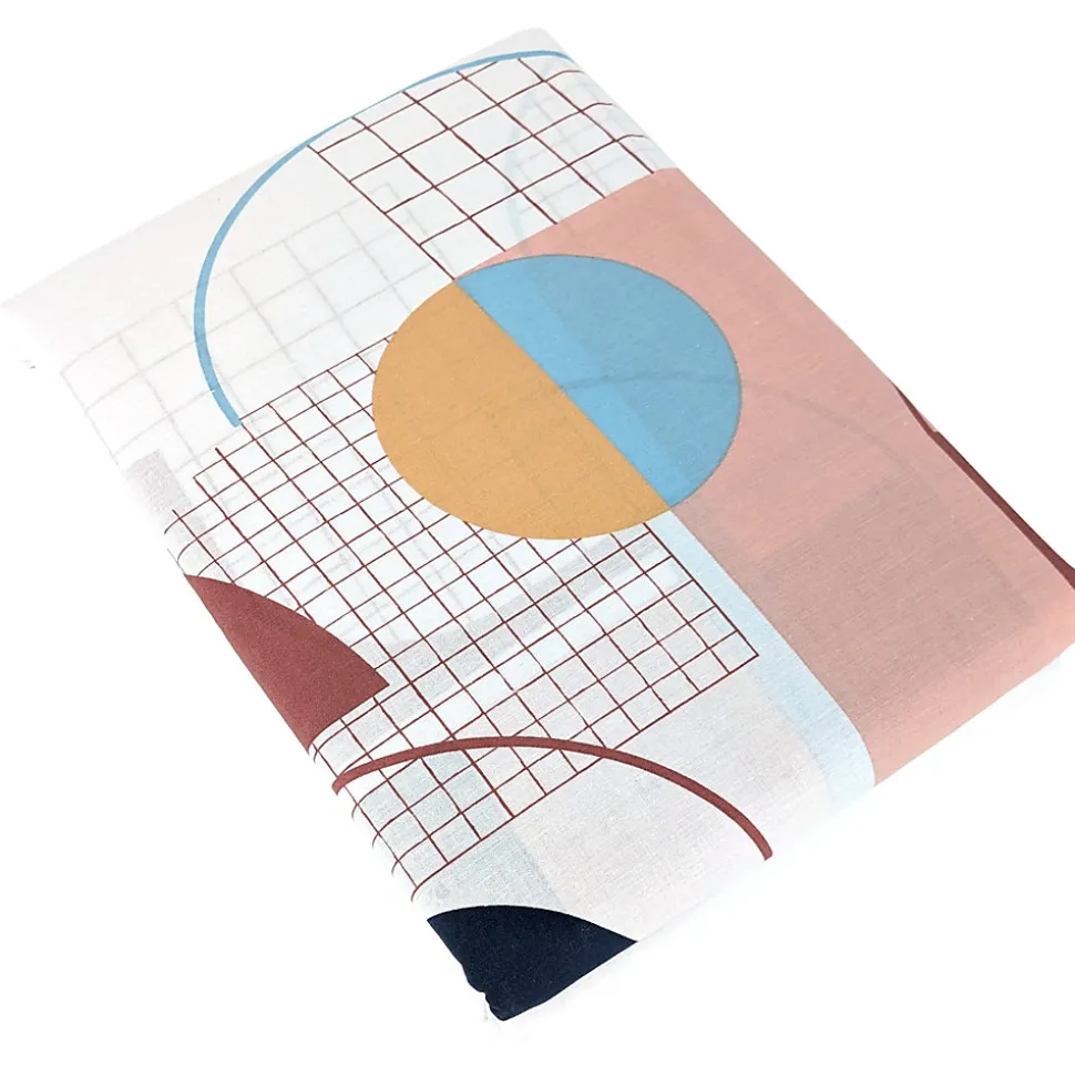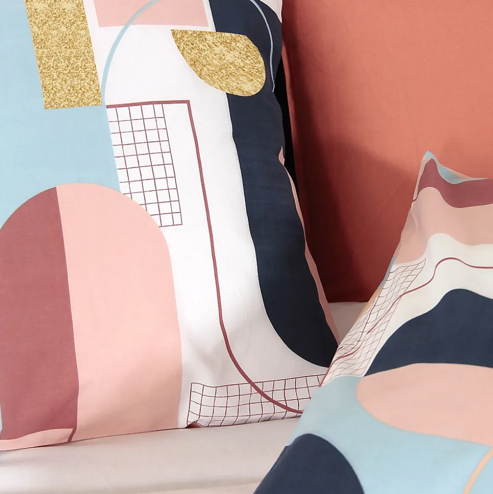 - Parure de lit en coton avec un bel effet géométrique pour ce motif imprimé de formes arrondies et filets imbriqués formant un design abstrait avec une impression doré pour certains motif dans des tons de rose, bleu et marine sur fond blanc.