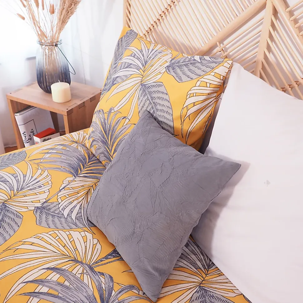 - Parure de lit en microfibre avec motif imprimé d’une composition de grandes feuilles dans des tons gris sur fond jaune.