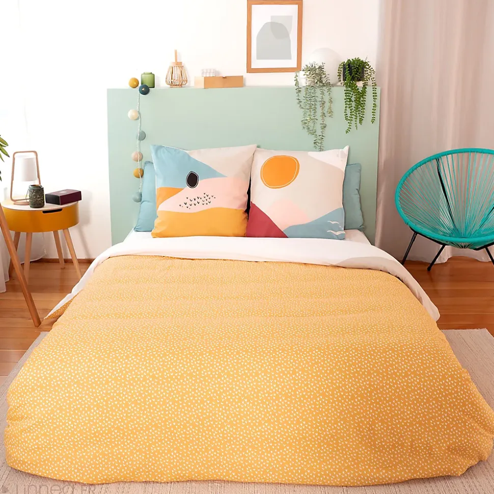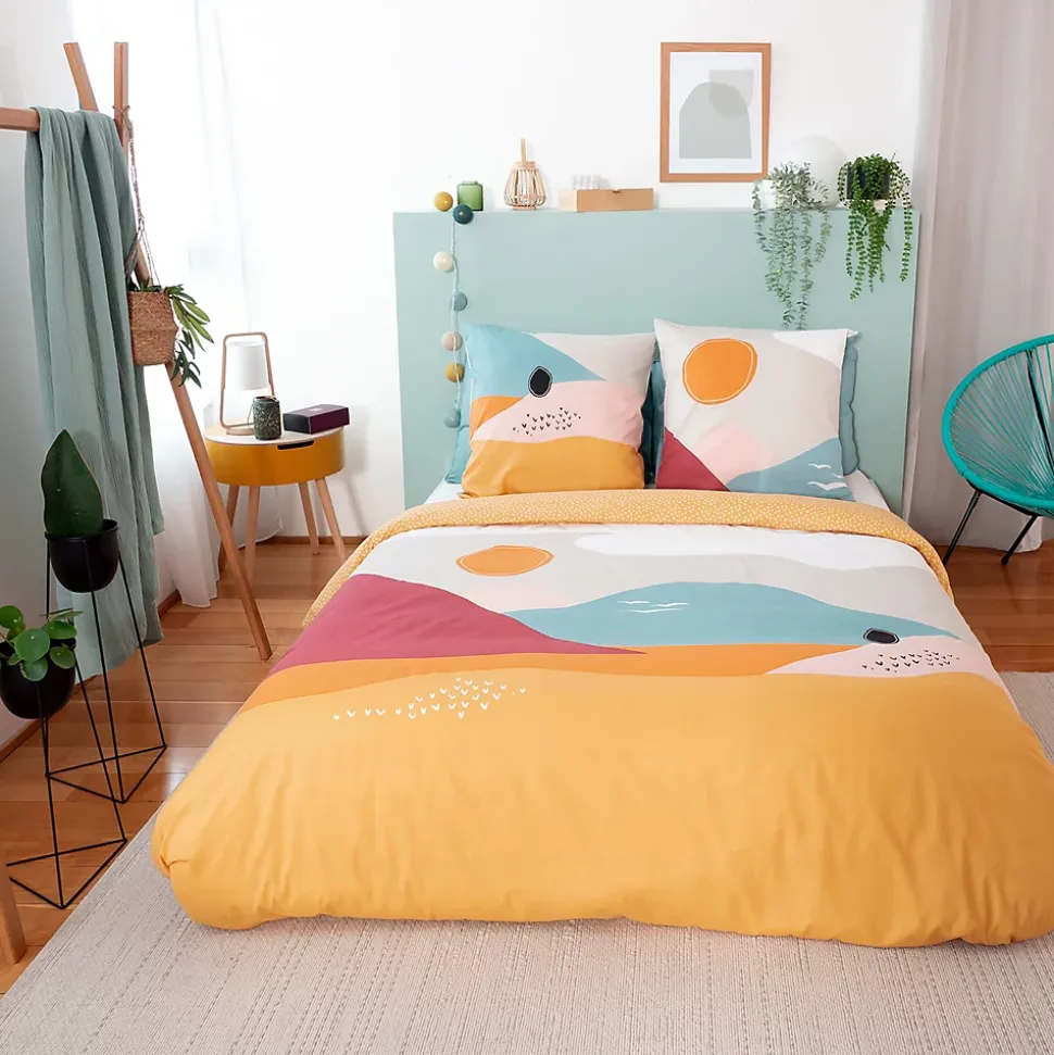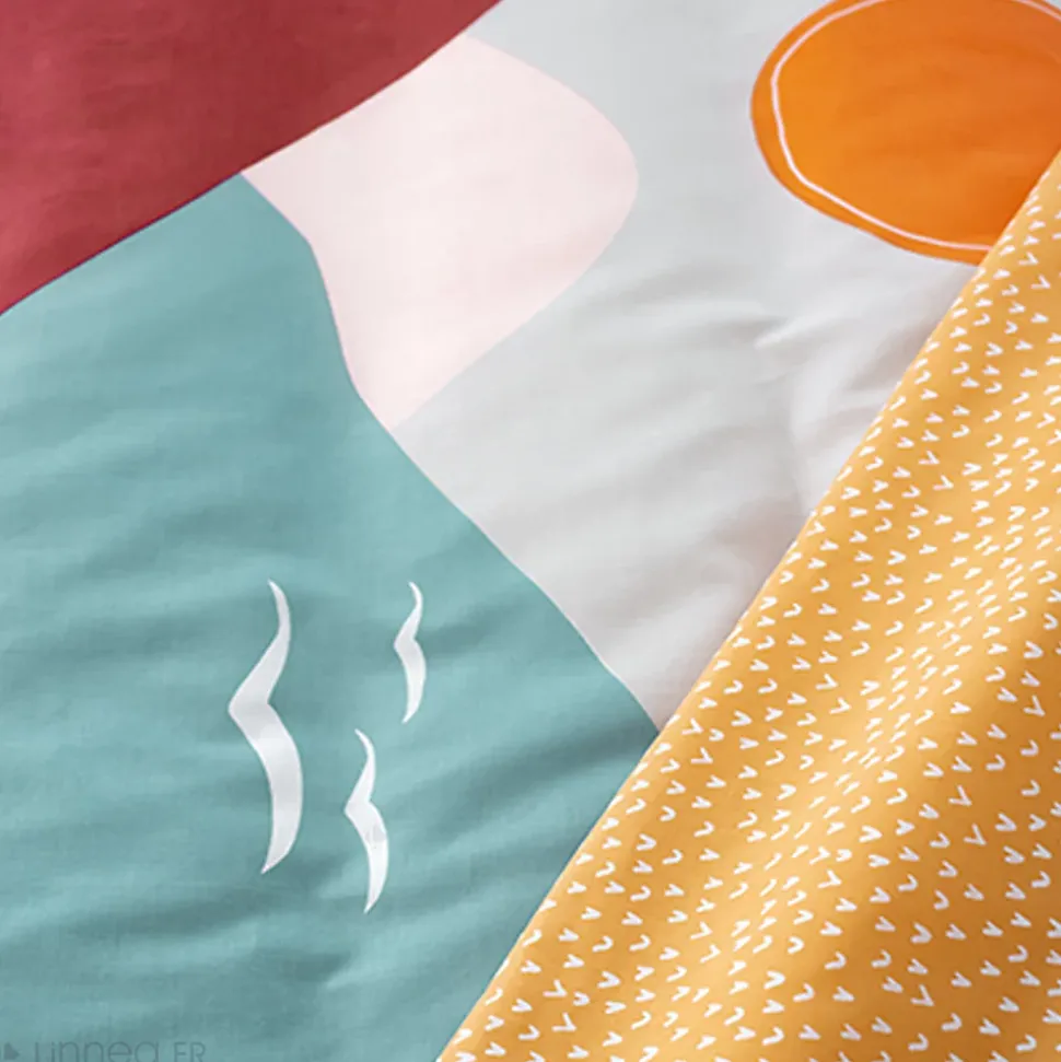Parure de lit 240×220 cm polycoton VALLON multicolore 3 piècesAmbiance bord de mer pour la parure de lit VALLON. Réversible, elle possède une face imprimée d’un dessin de paysage comportant soleil, oiseaux, montagnes, nuages, mer. L’autre face est imprimée d’un all-over de petits oiseaux blancs sur fond orange. De quoi faire de beaux rêves ! Composée de 52% de polyester et de 48% de coton, cette parure vous assurera également une grande résistance et une facilité d’entretien. Apprêtez vous à transformer votre lit en un véritable nid douillet !Côté technique :Matière : 52% polyester + 48% cotonQualité : 51 fils/cm2Grammage : 102g/m2Couleurs garanties grand teintHousse de couette avec finition sans rabat, fermeture boutons et passe-mains2 taies d’oreiller carrées 63×63 cm forme sacFabriqué au PakistanLes plus du produit :Le polycoton offre une grande résistance : il ne se déforme pas, ne se déchire pas et ne se froisse pas aisément.Beaux motifs imprimés pour cette parure de lit adulte pratique et confortable.Linge de lit certifié Standard 100 OEKO-TEX, pour des produits meilleurs pour votre santé.Côté pratique :Entretien facile : lavage en machine à 40°; séchage en sèche linge à température réduite; javel et chlore interditConseils : Lavez votre linge avant la première utilisation; respectez toujours les conseils d’entretien figurant sur l’étiquette du produit; retournez les housses de couettes et les taies d’oreillers pour les laver sur l’envers.Symboles d’entretien :Cycle normal 40°CPas de blanchimentSéchage en tambour autorisé, température modérée 60°CRepasser à une température maximale de semelle de fer de 150°CPas d'entretien p