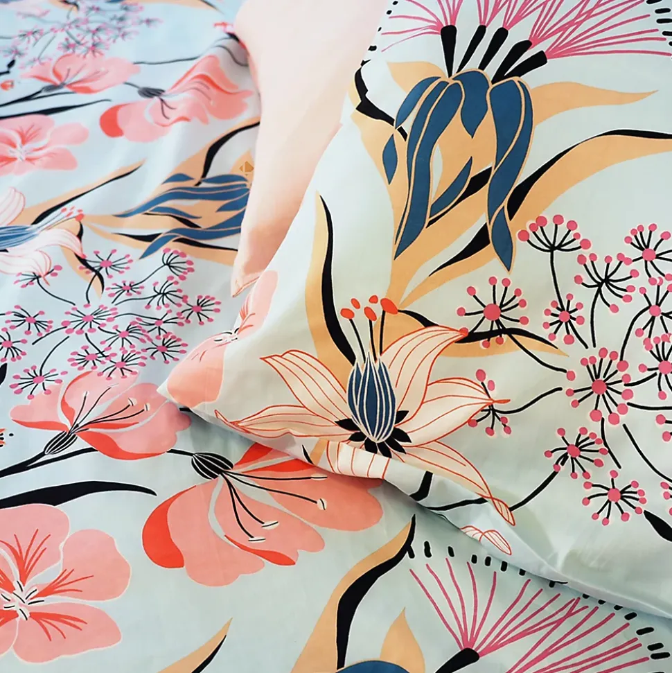 - Parure de lit en véritable satin de coton avec un superbe motif de végétation composé de grandes feuilles stylisées, de magnifiques fleurs et des oiesaux dans des coloris très actuels sur un fond bleu pâle.