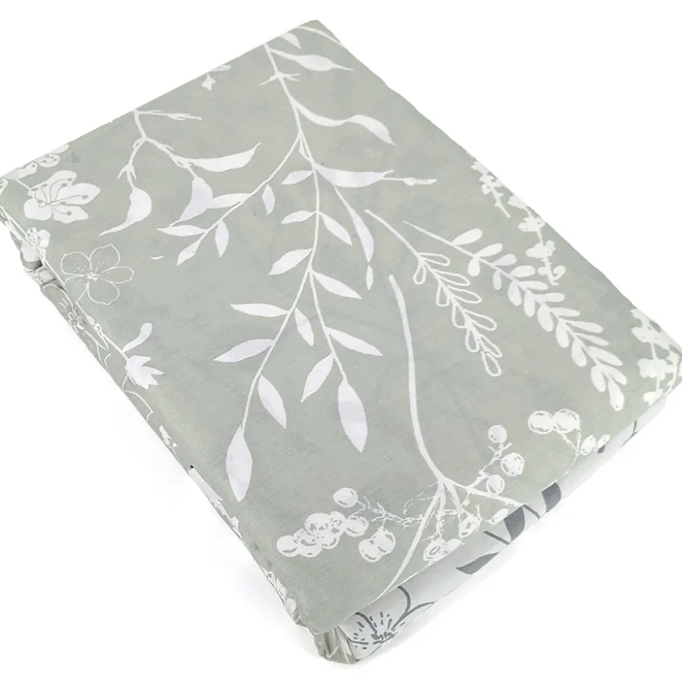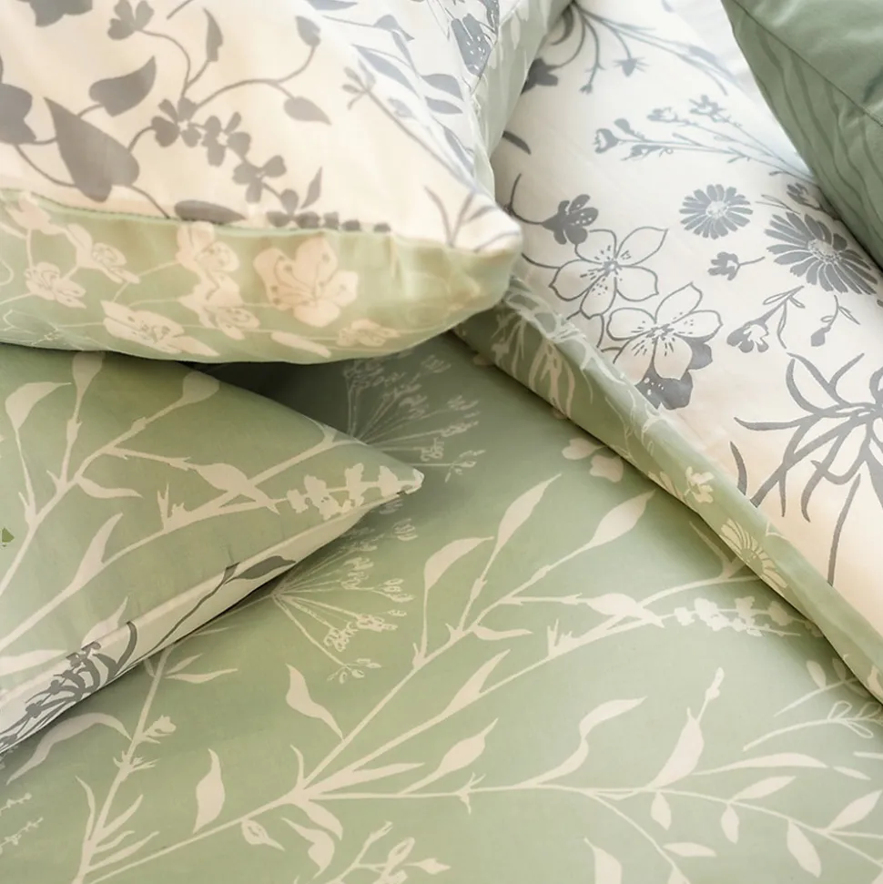 - Parure de lit en véritable satin de coton avec un motif de végétation printanière composées de brins de feuilles et fleurs colorés en blanc sur un fond vert pâle.