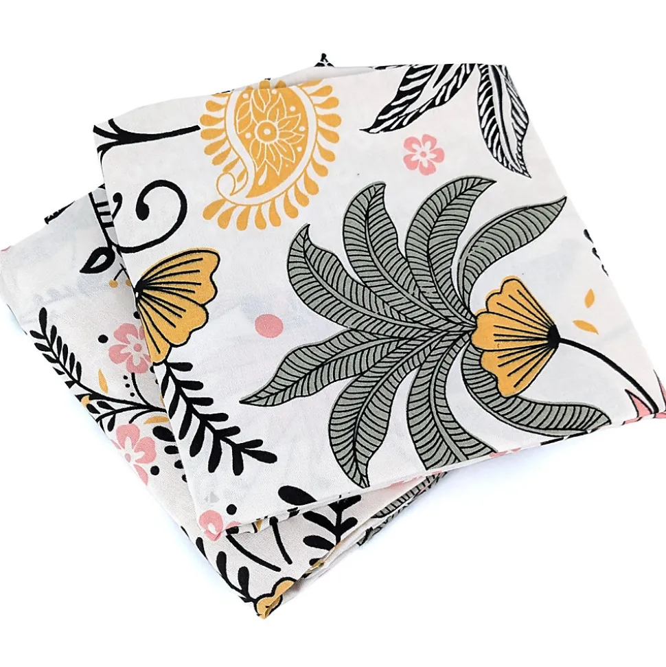 PARURE DE LIT WAYAN 240×220 CMParure de lit composée d’une housse de couette 240×220 cm et 2 taies 63×63 cmAmbiance estivale avec cette parure de lit imprimée d’une végétation avec des fleurs et feuilles stylisées façon arabesques dans des tons de rose, jaune et noir sur fond blanc. La collection linge de lit WAYAN en satin de coton est idéale pour une décoration qui donnera un look de prairie à votre chambre.Housse de couette avec une face imprimée d’un motif végétal all-over de fleurs et feuillers dans des tons jaune, rose et noir sur fond blanc, sur l’autre face all-over de petit motifs blanc sur fond jaune bourdon. Finition sans rabat aux pieds, fermeture par boutons, et passe-mains pour enfiler la couette facilement.Taie d’oreiller carrée avec deux faces imprimées différentes, motif coordonné avec la housse de couette. Finition simple, forme portefeuille avec un rabat intérieur.Côté technique :Matière : satin de coton issu de l’agriculture biologique GOTSQualité : coton 112 g/m2 78 fils/cm2Couleurs garanties grand teintHousse de couette 240×220 avec finition sans rabat, fermeture boutons et passe-mainsTaie d’oreiller carrée 63×63 cm forme portefeuille, avec grand rabat intérieur, finition simpleFabriqué au PakistanLes plus du produit :Qualité de tissu en satin de coton issu de l’agriculture biologique, et beau motifs imprimés pour ce linge de maison très qualitatif.Linge de lit certifié GOTS entièrement composés de coton issu de l’agriculture biologique et Standard 100 OEKO-TEX, pour des produits meilleurs pour votre santé.Différence entre percale de coton et satin de coton ? Le satin de coton est fabriqué à partir de fils de cotons très fins et avec un tissage ou chaque fil horizontal traverse trois fils (trame/chaine) et repasse dessous par la su