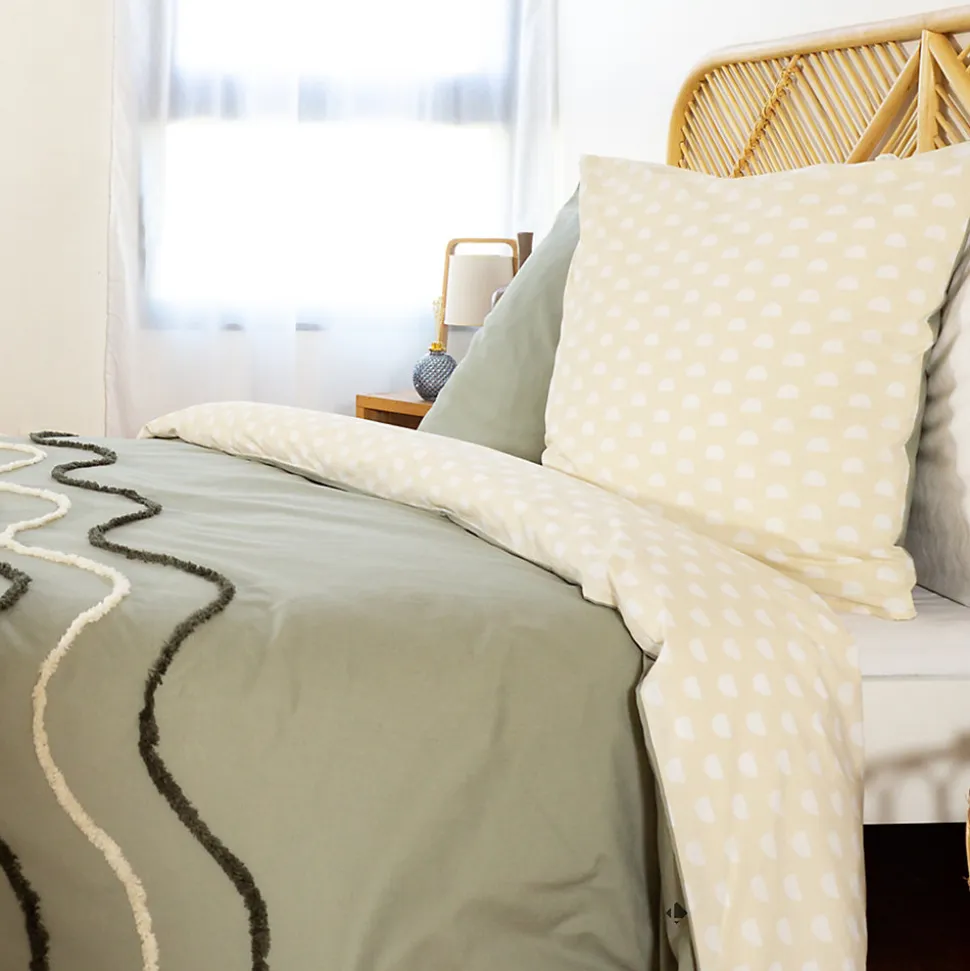 PARURE DE LIT LINEA 260×240 CMParure de lit imprimée composée d’une housse de couette 260×240 cm et 2 taies d’oreillers 63×63 cmAmbiance originale avec cette parure de lit 2 personnes réversible avec un motif tufté de lignes en formes de vagues.La collection linge de lit LINEA en coton est idéale pour une décoration de chambre atypique et moderne.Housse de couette reversible avec une face motif tufté de trois grandes lignes en forme de vague en partie haute dans des tons vert foncé et ivoire sur fond vert wasabi, sur l’autre face all-over de petit motif sur fond uni crème. Finition sans rabat aux pieds, fermeture par boutons, et passe-mains pour enfiler la couette facilement.Taie d’oreiller carrée avec une face uni vert wasabi et une face all-over blanc sur fond crème. Finition simple, forme portefeuille avec un rabat intérieur.Côté technique :Matière : Coton BCI adouci 57 fils/cm2Qualité : 110 g/m2Couleurs garanties grand teintHousse de couette 260×240 avec finition sans rabat, fermeture boutons et passe-mainsTaie d’oreiller carrée 63×63 cm forme portefeuille, avec grand rabat intérieur, finition simpleFabriqué au PakistanLes plus du produit :Originales, les parures tuftées 100% coton adouci s’adressent à ceux qui veulent mêler élégance et originalité. Des mèches de coton sont intégrées lors du tissage pour offrir un style unique qui ne se dégradera pas au fil des lavages.Parure de lit labellisé « BCI : Better Cotton » qui contribue à l’amélioration des méthodes de production du coton à l’échelle mondiale.Linge de lit certifié Standard 100 OEKO-TEX, pour des produits meilleurs pour votre santé. Côté pratique : Entretien facile, lavage en machine à 40°C, javel et clore interdit, séchage en sèche-linge à tempé