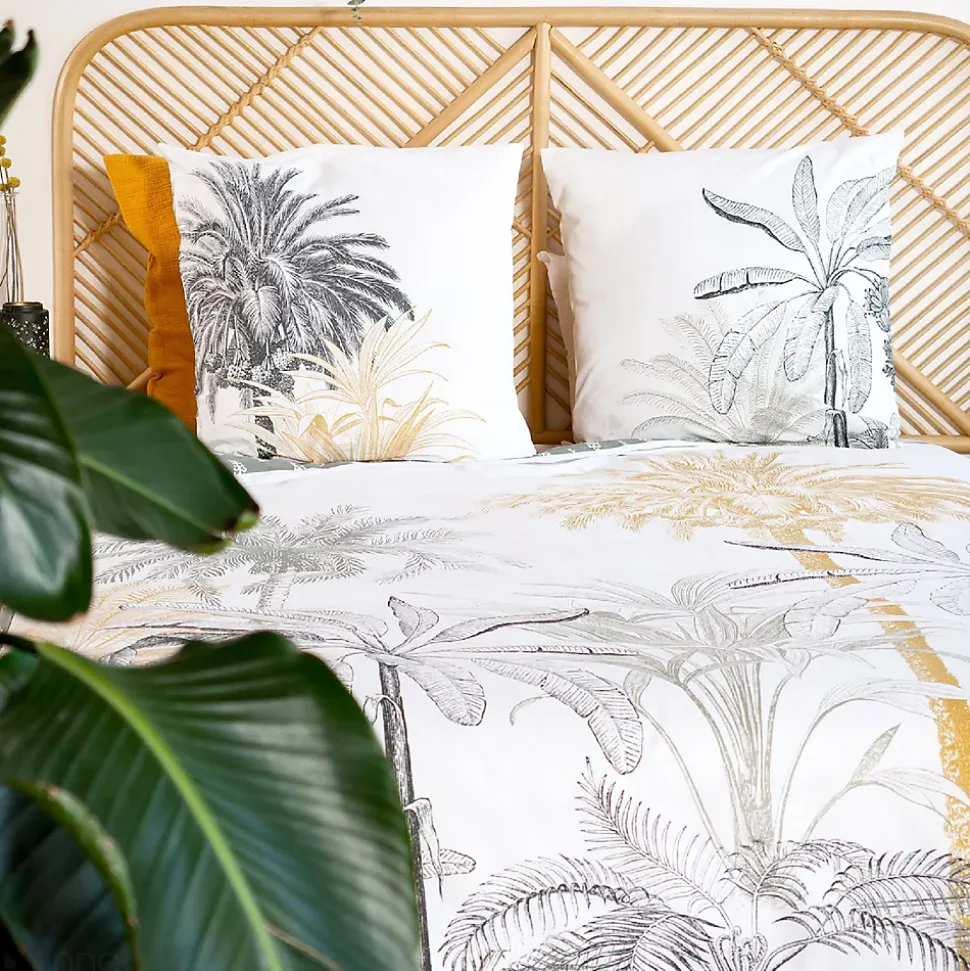 Parure de lit 260×240 cm coton SOLI vertCréez une ambiance chaleureuse au sein de votre chambre avec la parure de lit SOLI. Réversible, elle posséde une face avec un all-over de motifs géométriques sur fond vert. L’autre face posséde des motifs de palmiers, de cocotiers et d’arbres exotiques. De quoi apporter du soleil dans vos rêves ! En 100% coton BCI adouci, cette parure vous assurera également une grande souplesse et un toucher très doux.Côté technique :Matière : 100% coton BCI adouciGrammage : 115 g/m2Finition : Housse de couette sans rabat, fermeture boutons et passe-mains forme rectangulaireTaies d’oreillers carrées 63×63 cm forme sac avec rabatFabriqué au PakistanLes plus du produit :Belle qualité de coton pour une douceur inégaléeLinge de lit certifié Standard 100 OEKO-TEX, pour des produits meilleurs pour votre santé.Collection SOLI disponible en parures de lit 240×220 cm, 260×240 cm avec 2 taies d’oreillers 63×63 cmCôté pratique :Entretien facile : lavage en machine à 40°C; séchage en sèche-linge à température réduite; javel et chlore interditsConseils : Lavez votre linge avant la première utilisation; respectez toujours les conseils d’entretien figurant sur l’étiquette du produit; retournez les housses de couettes et les taies d’oreillers pour les laver sur l’envers.Symboles d’entretien :Cycle normal 40°CPas de blanchimentSéchage en tambour autorisé, température modérée 60°CRepasser à une température maximale de semelle de fer de 110°CPas d'entretien professionnel à sec
