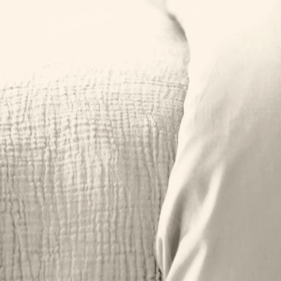 Matière double face : Une face en double gaze de coton 140 g/m² pour une douceur gaufrée, l’autre en coton 57 fils/cm² offrant confort et respirabilité.