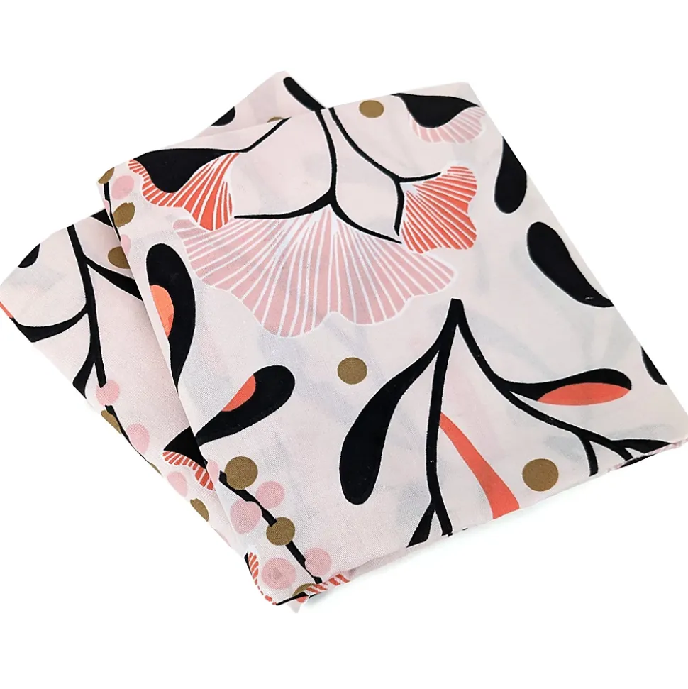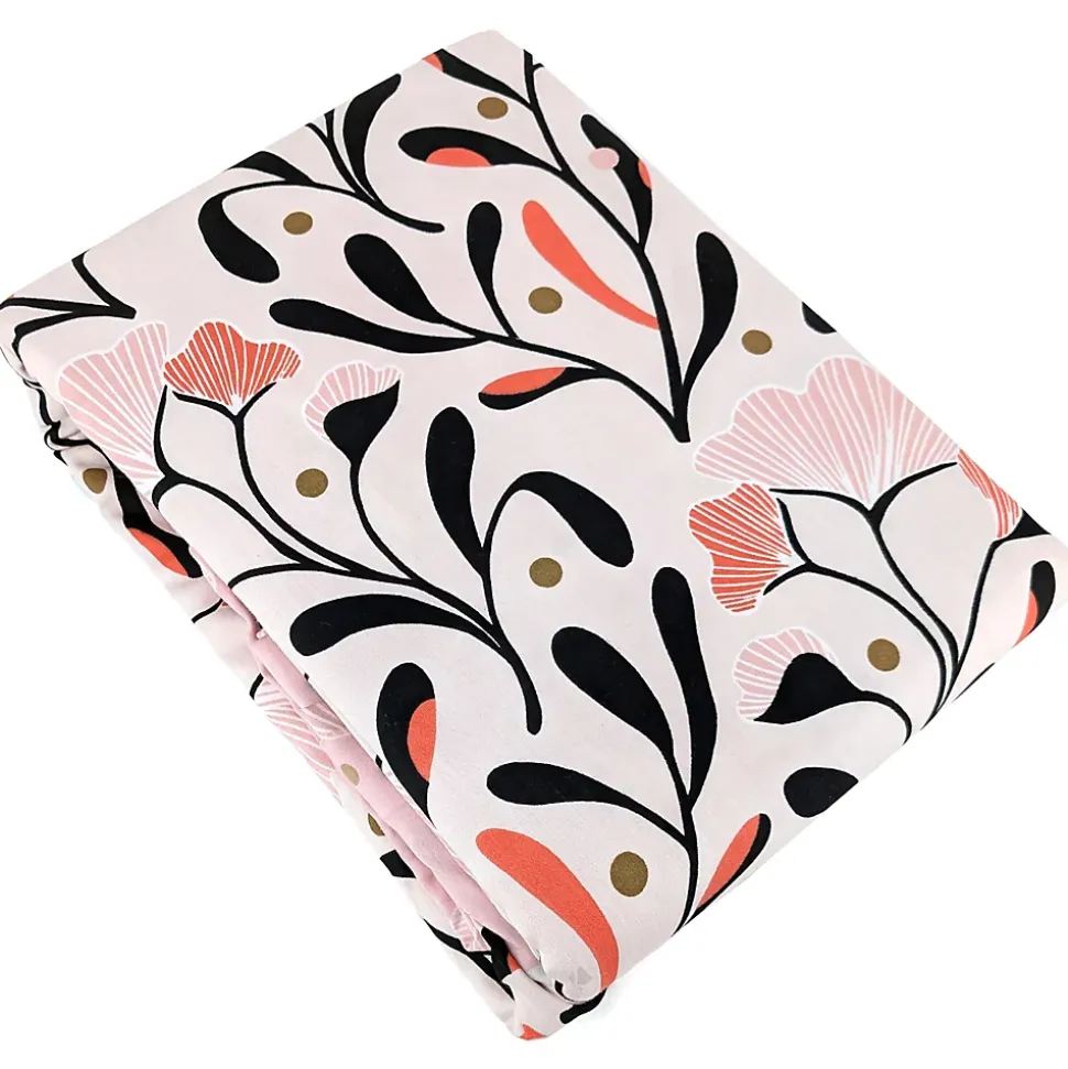 - Parure de lit en véritable satin de coton avec un motif de végétation composé de feuilles stylisées sur tiges noires avec de petits bourgeons roses et dorés sur un fond rose crème.