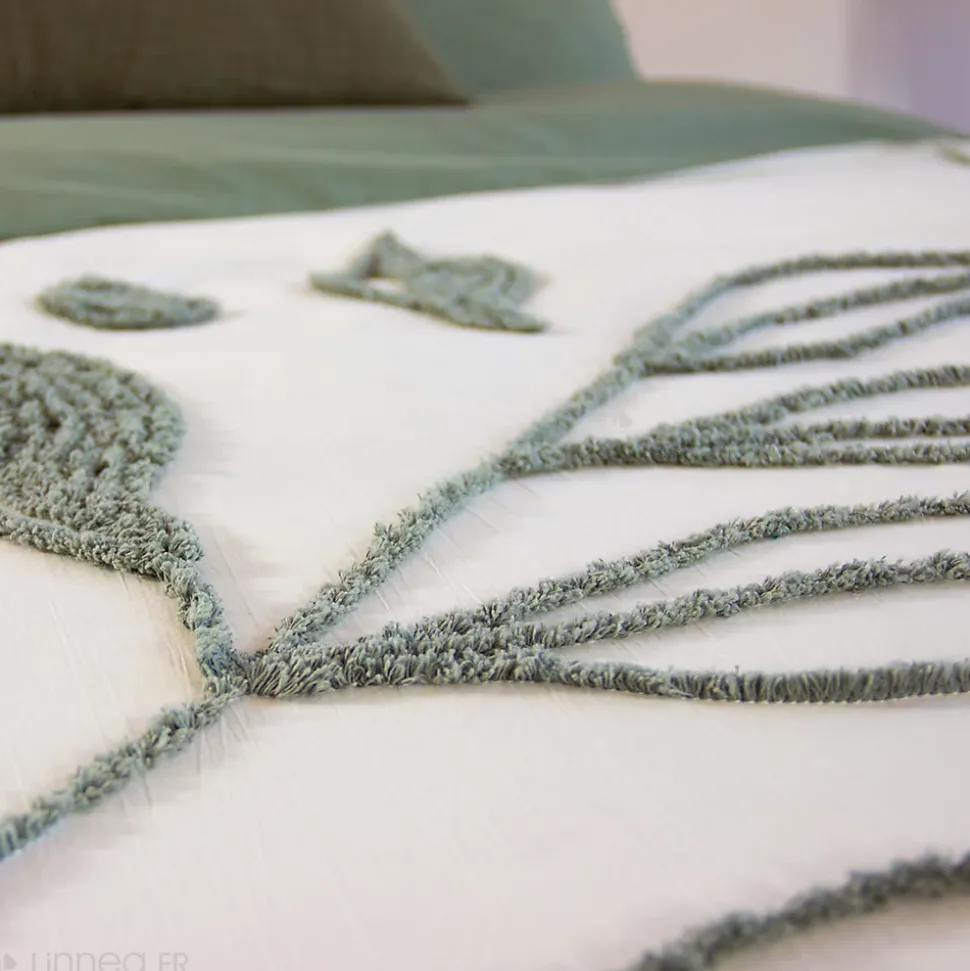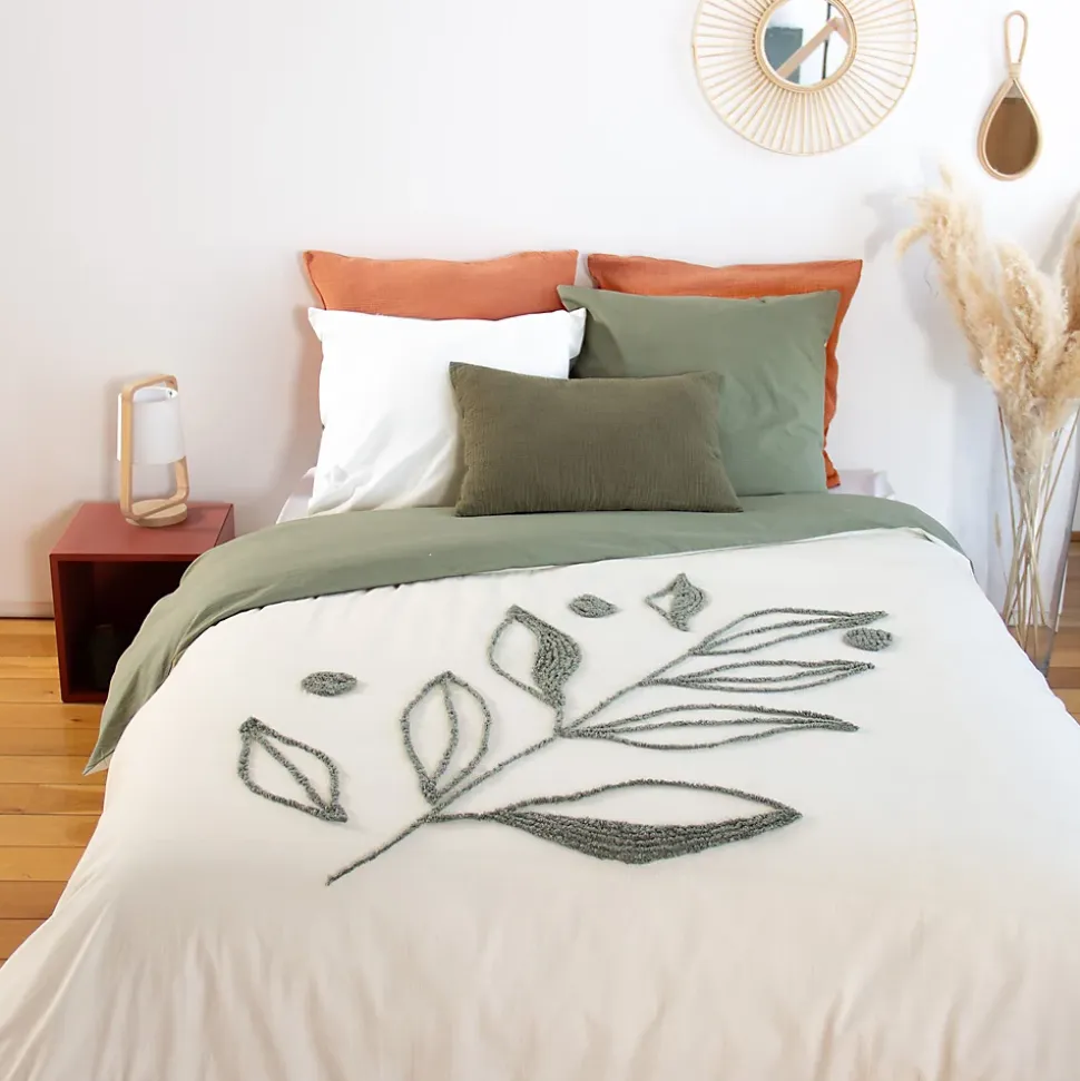 Parure de lit 240×220 HERBIER coton lavéPlongez dans le confort et l’élégance avec notre parure de lit en coton lavé 52 fils/cm2. Ses finitions tuftées en forme de feuillage apportent une touche naturelle et raffinée à votre espace, tandis que la certification OEKO-TEX et Better Cotton garantit un choix . La housse de couette, pratique avec ses boutons dissimulés et passes mains, vous offre une facilité d’utilisation inégalée. Cette parure combine subtilement fonctionnalité et style, pour des nuits enveloppées de douceur et de conscience économie circulaire.Côté technique :Matière : Coton lavéComposition : 100% cotonContexture : 52 fils/cm2Motifs : feuillage1 housse de couette 240×220 avec finition sans rabat, fermeture boutons et passe-mains2 taies d’oreillers carrées 63×63 cm forme sac avec rabatFabriqué au PakistanLes plus du produit :Coton lavé apportant douceur et souplesseCollection HERBIER disponible en parure de lit 220x220cm avec 2 taies d’oreillers 63x63cm et 240×220 avec 2 taies d’oreiller 63×63 cm.Linge de lit très résistant, doux et à petit prixUne parure avec finitions tuftées pour un linge de lit avec un beau reliefCôté pratique :Entretien facile : lavage en machine à 40°C; séchage en sèche-linge à température réduite; javel et chlore interditsUn séchage en machine à basse température est possible, mais le séchage à l’air libre est préférable pour préserver la qualité des fibres et des finitions tuftées. Évitez l’exposition directe au soleil.Si nécessaire, repassez à température moyenne. Pour les finitions tuftées, il est recommandé de repasser sur l’envers ou d’utiliser un linge de protection pour éviter d’aplatir ou d’endommager les motifs.Conseils : Lavez votre linge avant la pre