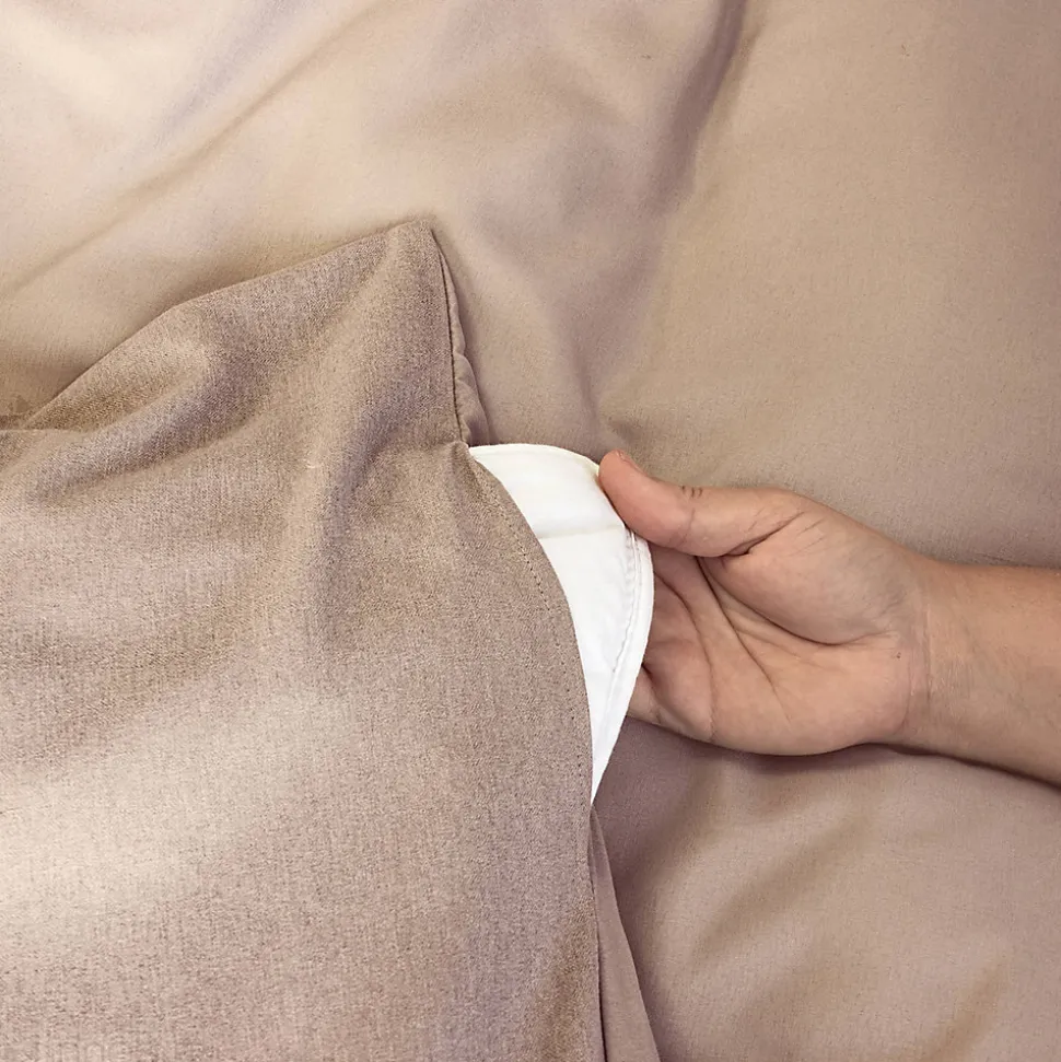 - Housse de couette dotée de fentes passe-mains facilitant l’habillage du lit, avec fermeture à boutons assurant un maintien impeccable.
