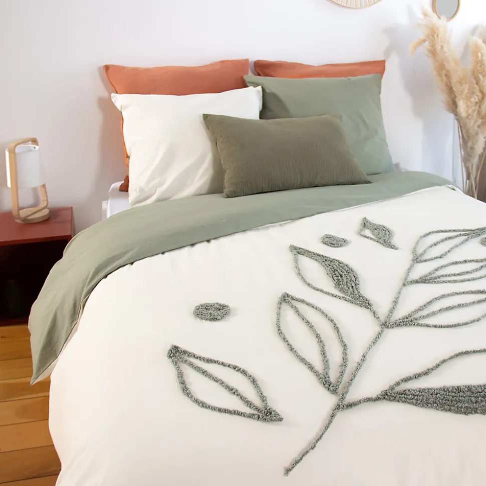 Parure de lit 260×240 HERBIER coton lavéPlongez dans le confort et l’élégance avec notre parure de lit en coton lavé 52 fils/cm2. Ses finitions tuftées en forme de feuillage apportent une touche naturelle et raffinée à votre espace, tandis que la certification OEKO-TEX et Better Cotton garantit un choix . La housse de couette, pratique avec ses boutons dissimulés et passes mains, vous offre une facilité d’utilisation inégalée. Cette parure combine subtilement fonctionnalité et style, pour des nuits enveloppées de douceur et de conscience économie circulaire.Côté technique :Matière : Coton lavéComposition : 100% cotonContexture : 52 fils/cm2Motifs : feuillage1 housse de couette 260×240 avec finition sans rabat, fermeture boutons et passe-mains2 taies d’oreillers carrées 63×63 cm forme sac avec rabatFabriqué au PakistanLes plus du produit :Coton lavé apportant douceur et souplesseCollection HERBIER disponible en parure de lit 240x220cm avec 2 taies d’oreillers 63x63cm et 260×240 avec 2 taies d’oreiller 63×63 cm.Linge de lit très résistant, doux et à petit prixUne parure avec finitions tuftées pour un linge de lit avec un beau reliefCôté pratique :Entretien facile : lavage en machine à 40°C; séchage en sèche-linge à température réduite; javel et chlore interditsUn séchage en machine à basse température est possible, mais le séchage à l’air libre est préférable pour préserver la qualité des fibres et des finitions tuftées. Évitez l’exposition directe au soleil.Si nécessaire, repassez à température moyenne. Pour les finitions tuftées, il est recommandé de repasser sur l’envers ou d’utiliser un linge de protection pour éviter d’aplatir ou d’endommager les motifs.Conseils : Lavez votre linge avant la pre