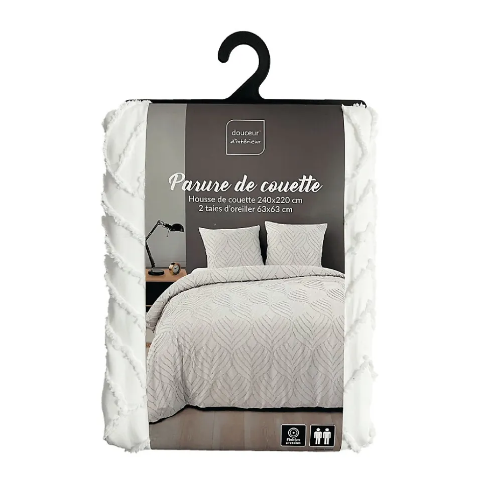 Avec son design tufté et sa couleur blanche intemporelle, cette parure apportera une touche de sophistication à votre chambre à coucher. Fabriquée en microfibre de haute qualité, cette parure de lit est à la fois douce au toucher et facile à entretenir. De plus, les taies d’oreiller assorties de 63×63 cm complètent parfaitement l’ensemble, ajoutant une touche finale de confort et d’élégance à votre literie. Informations complémentaires Matière : Microfibre Inclus: une taie pour la taille 140×200 cm et deux taies pour les dimensions 240×220 cm et 260×240 cm Taie(s) : 63x63cm