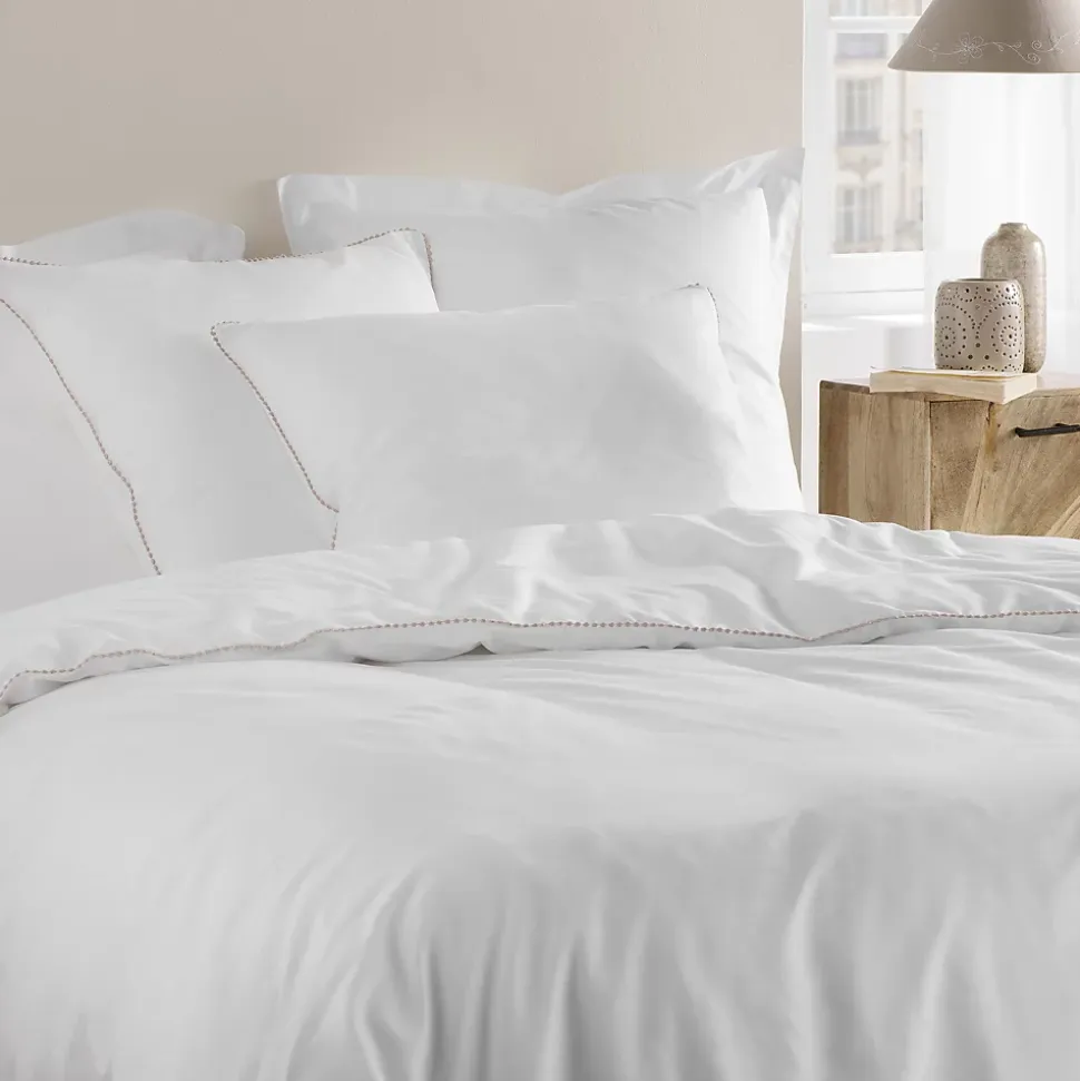 Fabriquée en coton de haute qualité, cette parure vous enveloppe de douceur et de confort. Très chic, l’indispenssable parrure 3 pièces blanche s’habille de fins galons pompons beige. Elle est munie d’une fermeture pratique par pressions pour un habillage facile. La housse de couette mesure 240×220 cm et les taies assorities mesurent 63×63 cm, offrant un aspect harmonieux à votre literie. Descriptions techniques : Dimensions : 240x220cm + 2 taies 63x63cm Matière : 100% coton Coloris : blanc Fermeture : pressions Vendue à l’unité