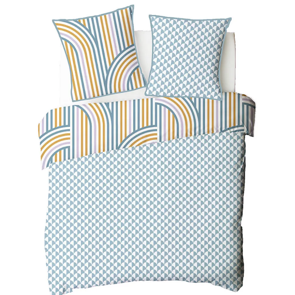 Parure de lit en microfibre réversible imprimé géométrique TANGO comprenant 1 housse de couette + 2 taies d’oreiller 63x63cmApportez une touche de modernité et de dynamisme à votre chambre avec la parure de lit Tango, conçue pour sublimer votre intérieur avec un design réversible et un imprimé géométrique audacieux dans des tons bleus et jaune. Son motif contemporain apporte du caractère à votre décoration tout en créant une atmosphère chaleureuse et élégante.Les taies d’oreiller assorties complètent l’ensemble avec harmonie, ajoutant une touche raffinée à votre lit. Conçue pour votre bien-être, la parure Tango est certifiée Oeko-Tex et lavable en machine à 30°, garantissant un entretien facile et une durabilité optimale.Nos parures Tango sont réalisées en microfibre lavée, une matière douce et soyeuse au toucher effet peau de pêche, offrant un confort incomparable.Offrez-vous le parfait équilibre entre style et confort avec Tango, une parure qui invite à la détente et à la douceur.A compléter avec nos draps housse de la collection ESSENTIEL – FUTURE HOMECOMPOSITIONS PRODUIT :Matière : 100% Polyester – Microfibre lavée – effet peau de pêcheCouleurs : MulticoloreFinition des taies : BiaisFinition de la housse de couette : boutonsCertification : OEKO-TEXLavage : à 30°C en machine2 taies d’oreiller 63x63cmEn savoir plus :Ce produit labélisé STANDARD 100 by OEKO-TEX – certificat n° 18.HPK48415 HOHENSTEIN HTTI suit un processus de fabrication certifié et contrôlé, respectueux de votre peau. Le STANDARD 100 by OEKO-TEX EST un label qui vous garantit que vos draps ne contiennent aucuns produits toxiques pour votre santé.