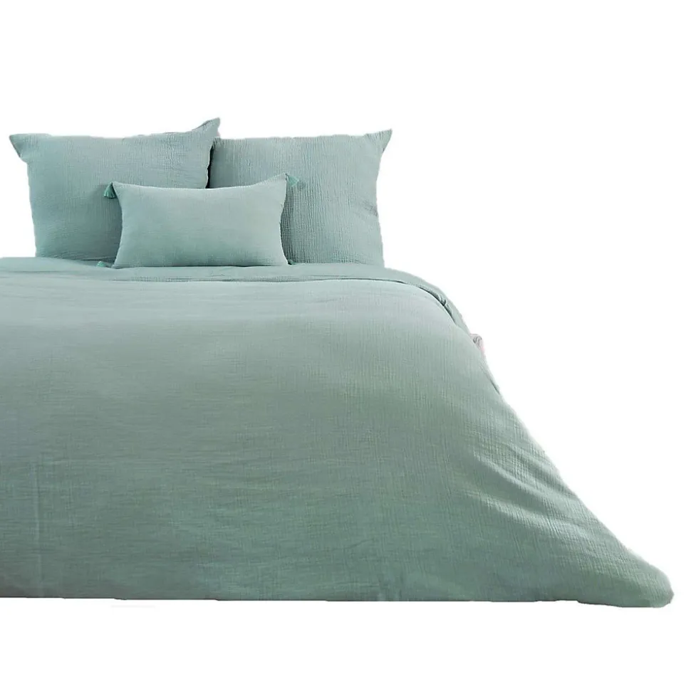Confectionnée avec un tissu de qualité supérieure en double gaze de coton léger, cette parure vous offre une expérience de sommeil luxueuse tout en apportant une touche de charme et de simplicité à votre chambre.FICHE TECHNIQUE- Parure de couette comprenant une housse de couette et deux taies d’oreiller- Matière : recto double gaze de coton 140 g/cm², verso 100% coton 57 fils/cm²- Tissu certifié OEKO-TEX- Avec boutons et passes-mains- Couleur : Amande- Convient parfaitement pour un lit 2 placesCARACTERISTIQUES TECHNIQUES- Dimensions de la housse de couette : L. 260 cm x l. 240 cm- Dimensions de la taie d’oreiller : L. 63 x l. 63 cm- Poids : 2,138 kg