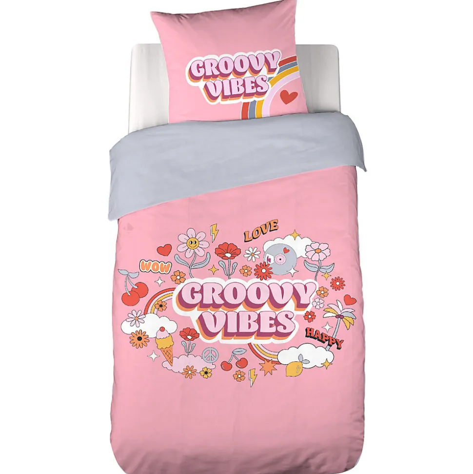 Parure de lit enfant GROOVY VIBES 140×200 cm en microfibre rose 2 piècesInvitez une ambiance fun et colorée dans la chambre de votre enfant avec la parure de lit « Groovy Vibes. » Inspirée des motifs joyeux et décalés des années 70, cette parure aux tons doux et vifs apporte un style rétro plein de caractère. Conçue en microfibre légère (72 g/m2), elle est douce au toucher et idéale pour garantir des nuits confortables et agréables.La parure comprend une housse de couette de 140×200 cm ainsi qu’une taie d’oreiller de 63×63 cm, parfaitement adaptées pour un lit d’enfant. Son tissu microfibre assure un entretien facile, résistant aux lavages fréquents tout en conservant sa douceur et ses couleurs vibrantes. Sur un fond rose éclatant, les motifs « Groovy Vibes, » entourés de fleurs, cœurs et petits symboles pop, créent une atmosphère joyeuse et positive, propice aux rêves et à l’imagination.Avec la collection « Groovy Vibes, » chaque détail a été pensé pour apporter de la bonne humeur et un confort optimal au quotidien. C’est la parure parfaite pour transformer la chambre de votre enfant en un espace dynamique et plein de vie.Côté technique :Composition : 100% polyesterMatière : microfibreGrammage : 72 g/m2Motifs : ImpriméColoris : RoseFinition : Housse de couette sans rabat, fermeture boutons et passe-mains forme rectangulaireTaies d’oreillers carrées 63×63 cm forme sac avec rabatFabriqué au PakistanLes plus du produit :Deux faces sur la parure de litCollection GROOVY VIBES disponible en parure de lit 140×200 cm avec une taie d’oreiller 63×63 cm.Côté pratique :Entretien facile : lavage en machine à 40°C; séchage en sèche-linge à température réduite; javel et chlore interditsConseils : Lavez votre linge avant la première utilisat