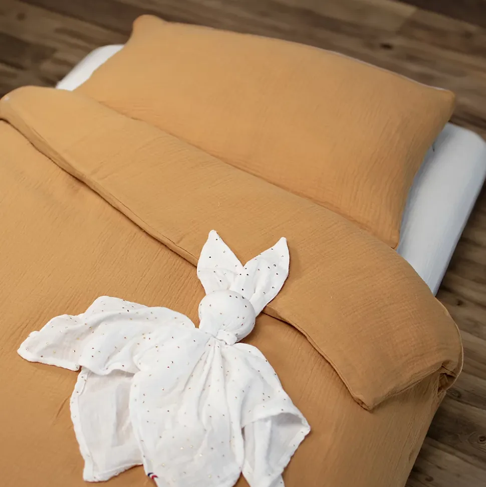 À la découverte de la douceur avec la parure de lit Jeanne en gaze de coton!Un intemporel en gaze de coton douce et légère !Offrez à votre enfant des nuits douces et apaisantes avec notre parure de lit Jeanne en gaze de coton. Cette parure, garantissant un confort exceptionnel, est composée d’une housse de couette et d’une taie d’oreiller. Confectionnée avec des matières de haute qualité certifiées, elle assure non seulement une grande douceur mais aussi la sécurité, .Thermo-régulante, la gaze de coton apporte de la fraîcheur en été et protège naturellement du froid en hiver.Une parure qui apportera une touche d’élégance à la chambre en associant douceur, légèreté et esthétisme. Notre collection Jeanne est confectionnée avec soin dans notre atelier français, favorisant un processus de fabrication en circuit court. Cette approche nous permet de garantir une qualité exceptionnelle tout en réduisant notre empreinte carbone.Ce modèle existe dans plusieurs tailles : 80 x 120 cm et 100 x 140 cm.La taie d’oreiller est de taille 40 x 60 cm.Collection Jeanne en gaze de cotonNotre collection Jeanne en gaze de coton se décline en nombreux coloris tendance et pastel. C’est un intemporel facile à utiliser dans la chambre de bébé et enfant, que ce soit en uni ou en mélangeant les couleurs. Tout est possible car ces coloris se marient parfaitement. La collection Jeanne propose une gamme complète de linge de lit et de maison : couvertures, couettes, gigoteuses et tours de lit