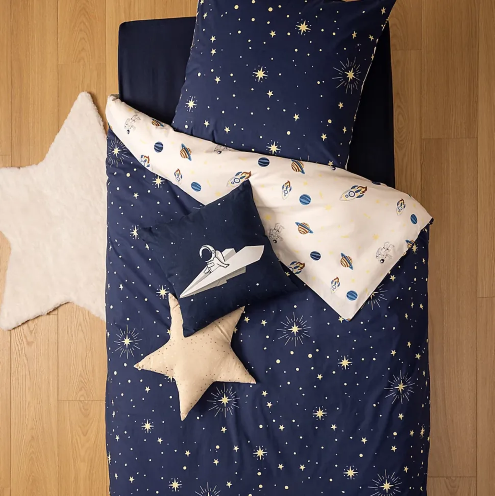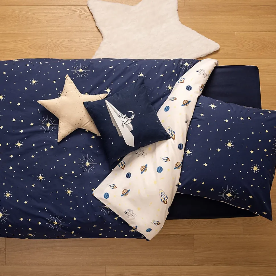 Pour que votre tout-petit fasse de jolis rêves, craquez pour la parure de lit « Espace » Atmosphera for kids.Un peu de magieCette parure de lit comprend une housse de couette et une taie d’oreiller. Les éléments sont réversibles et possèdent des fermetures boutonnées. Le motif espace plongera votre enfant dans un univers magique.Une matière de qualitéLa parure de lit « Espace » est confectionnée en coton, une matière douce et confortable. Elle se nettoie en machine jusqu’à 60°C et résistera aux multiples lavages.Installez cette parure sur un lit cabane Atmosphera for kids avec quelques coussins pour le rendre encore plus cosy.Le petit plus décoPour un coucher dans le calme, pensez à installer une veilleuse assortie sur le thème de l’espace.