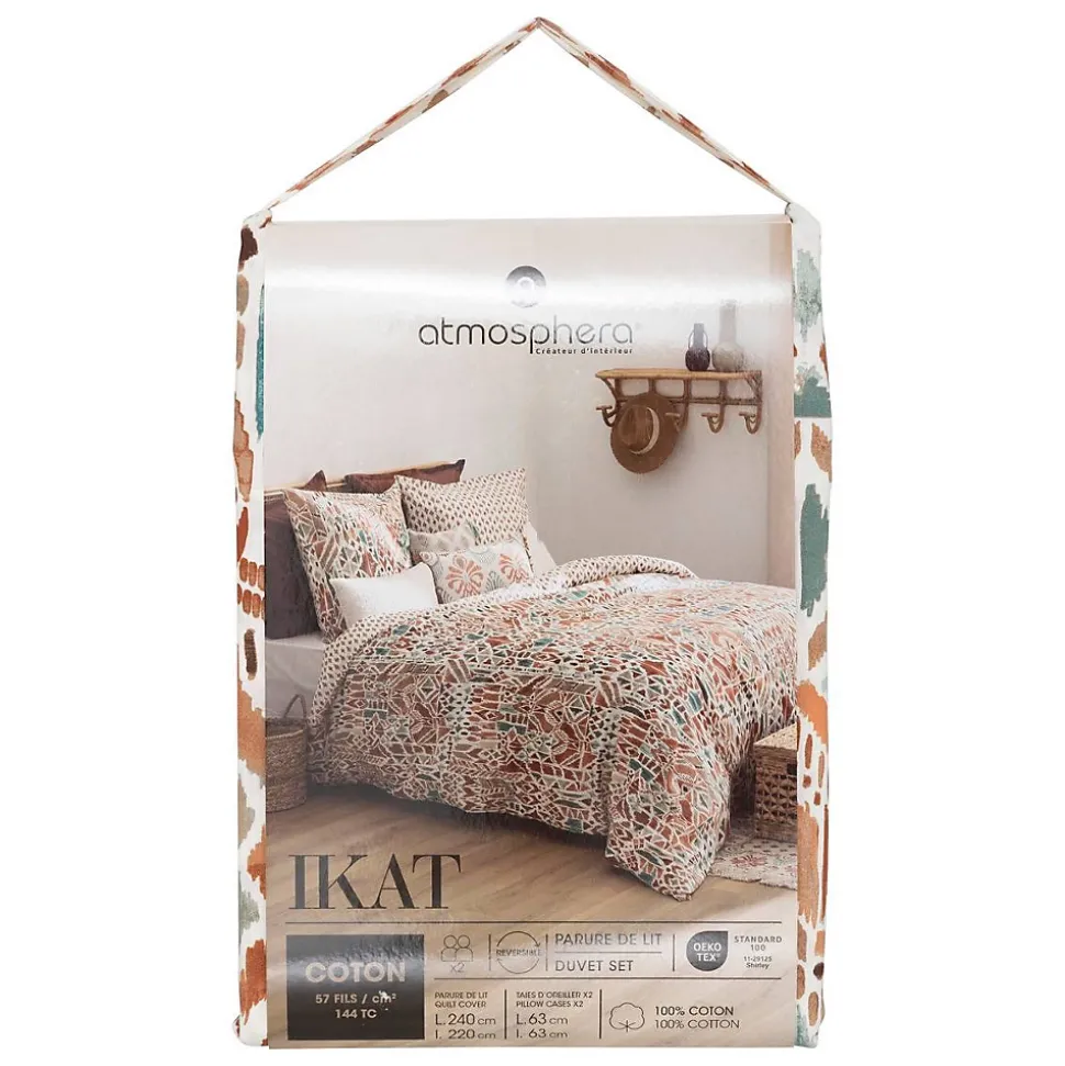 La parure de lit imprimée « Ikat » Atmosphera est conçue pour une housse de couette deux personnes et elle se distingue par ses motifs très chaleureux. La housse de couette en coton est réversible. Vous pourrez changer de sens au gré de vos envies, deux taies carrées coordonnées complétant l’ensemble. Choisissez un drap housse blanc Atmosphera à vos mesures pour accompagner cette parure de lit. 100 % coton, 115 g/m2Nombre de fils : 57/cm²Fermeture de la housse de couette : boutons Déballage et montage Lors de l’ouverture de votre colis, veillez à ne pas enfoncer une lame trop profondément pour éviter d’endommager le produit. Retirez les éléments de protection et d’emballage avec précaution, sans utiliser d’outils tranchants. Conservez l’emballage et la notice quelques jours en cas de retour ou de démontage. Consultez les consignes de tri de votre commune pour recycler correctement votre emballage. Conseils d’entretien La parure de lit imprimée « Ritchi » est lavable en machine à 60°. Ne pas faire sécher au soleil. Repassage à moyenne température (110°C à 150°C). Séchage en machine à basse température. Ne pas utiliser de produits de blanchiment. Pas de nettoyage à sec.