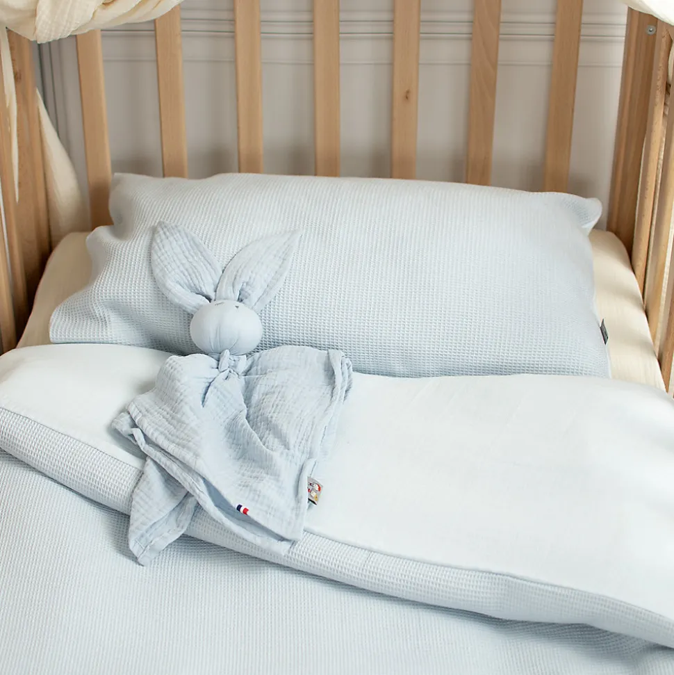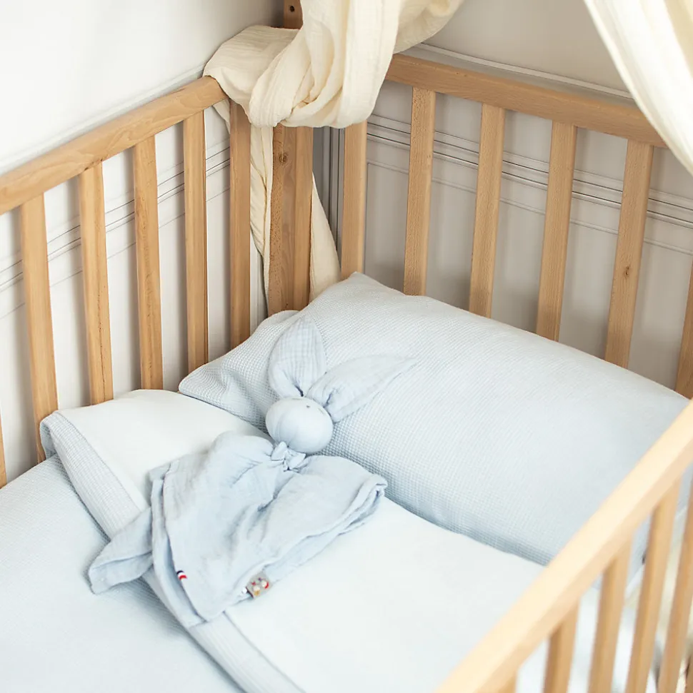 Parure de lit bébé réversible en coton nid d’abeille et gaze de coton. Douceur, respirabilité et confort toute l’année. Fabrication française Sevira Kids.