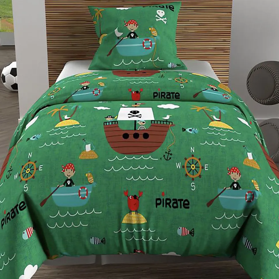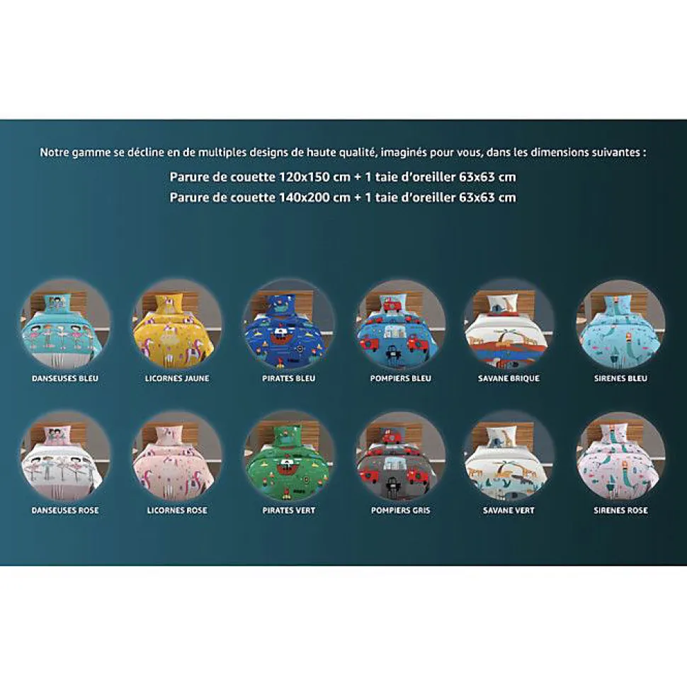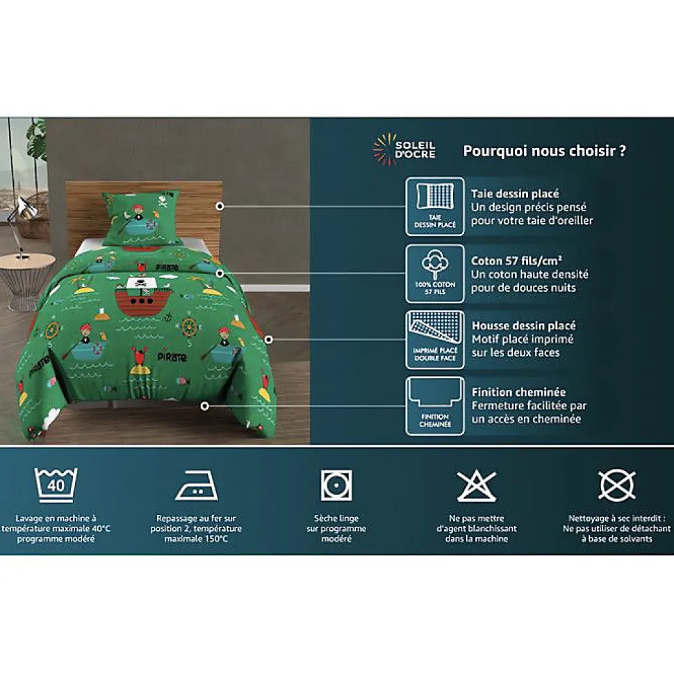Linge de lit imprimé en pur coton pour lit 1 personne. Qualité supérieure, tissage serré. Couleur: – blanc, jaune, marron, rouge, bleu, vert, noir. Composition: – 100 % coton 57 fils/cm2. Parure de lit: – housse de couette: 140×200 cm avec rabat de 40 cm. – 1 taie d’oreiller dessin placée 63×63 cm. Entretien: – Entretien facile – Lavage 40° en machine