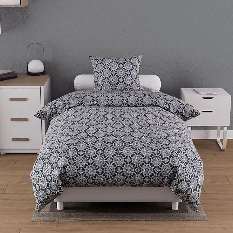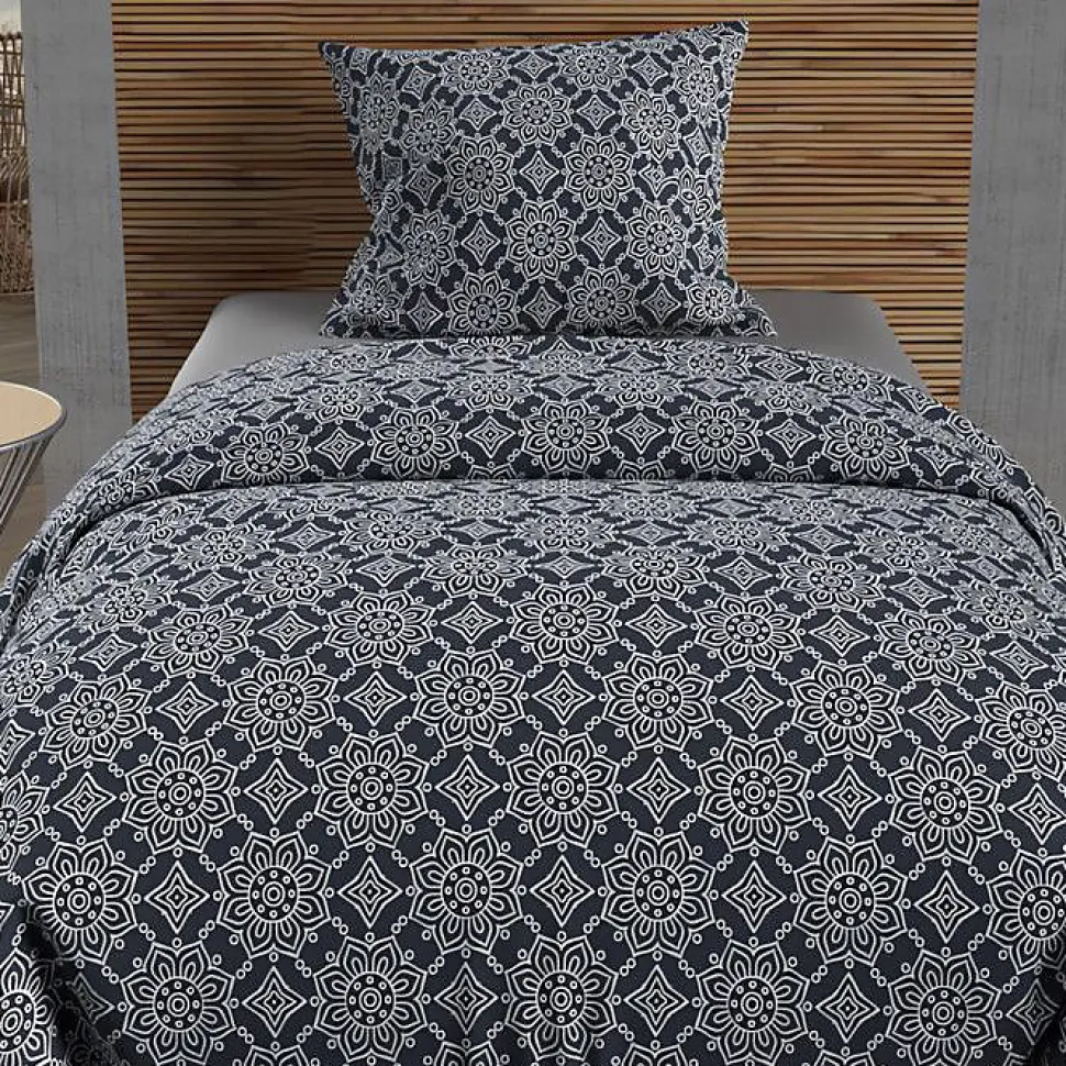 Linge de lit imprimé en pur coton pour lit 1 personne. Qualité supérieure, tissage serré. Couleur: – Bleu marine. Composition: – 100 % coton 57 fils/cm2. Parure de lit: – housse de couette: 140×200 cm avec rabat de 40 cm. – 1 taie d’oreiller dessin placée 63×63 cm. Entretien: – Entretien facile – Lavage 40° en machine