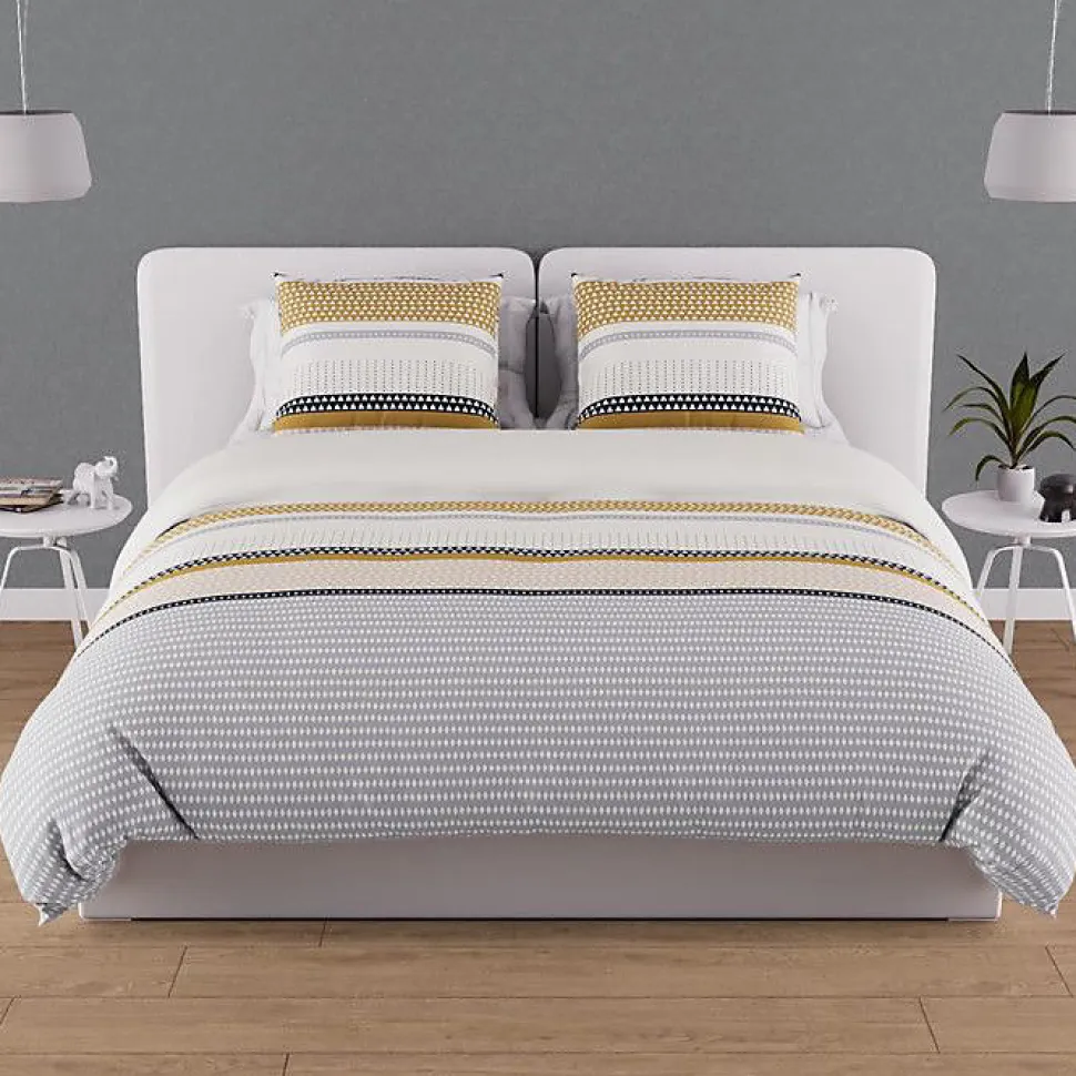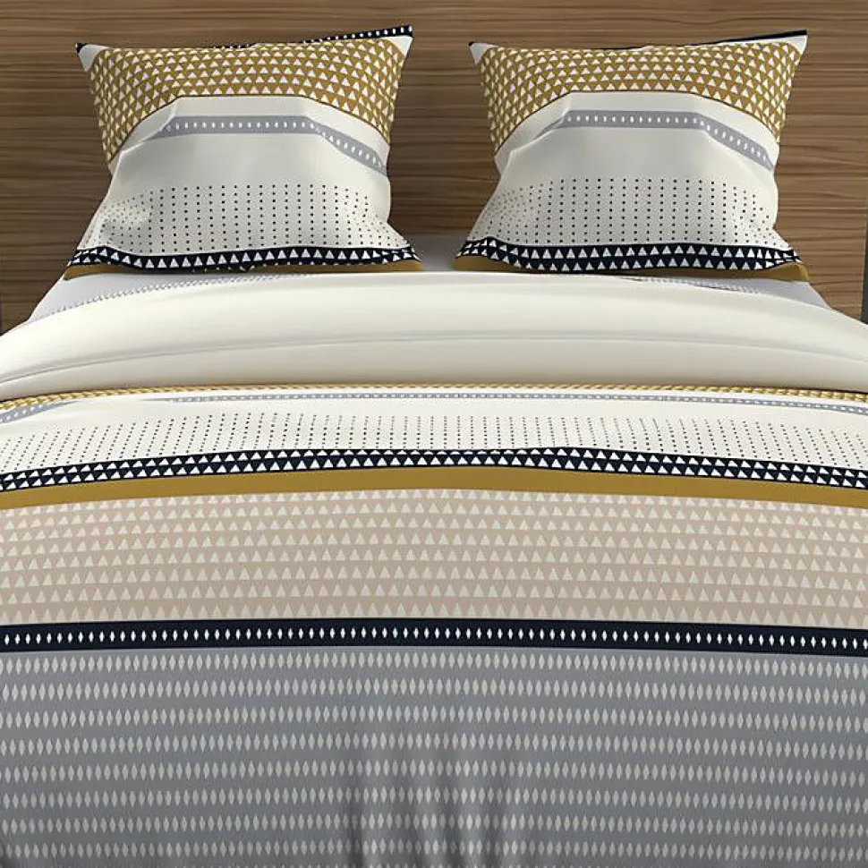 Linge de lit imprimé en pur coton pour lit 2 personnes. Qualité supérieure, tissage serré. Couleur: – Moutarde et gris. Composition: – 100 % coton 57 fils/cm2. Parure de lit: – housse de couette: 240×220 cm avec rabat de 40 cm. – 2 taies d’oreiller dessin placé 63×63 cm. Entretien: – Entretien facile – Lavage 40° en machine